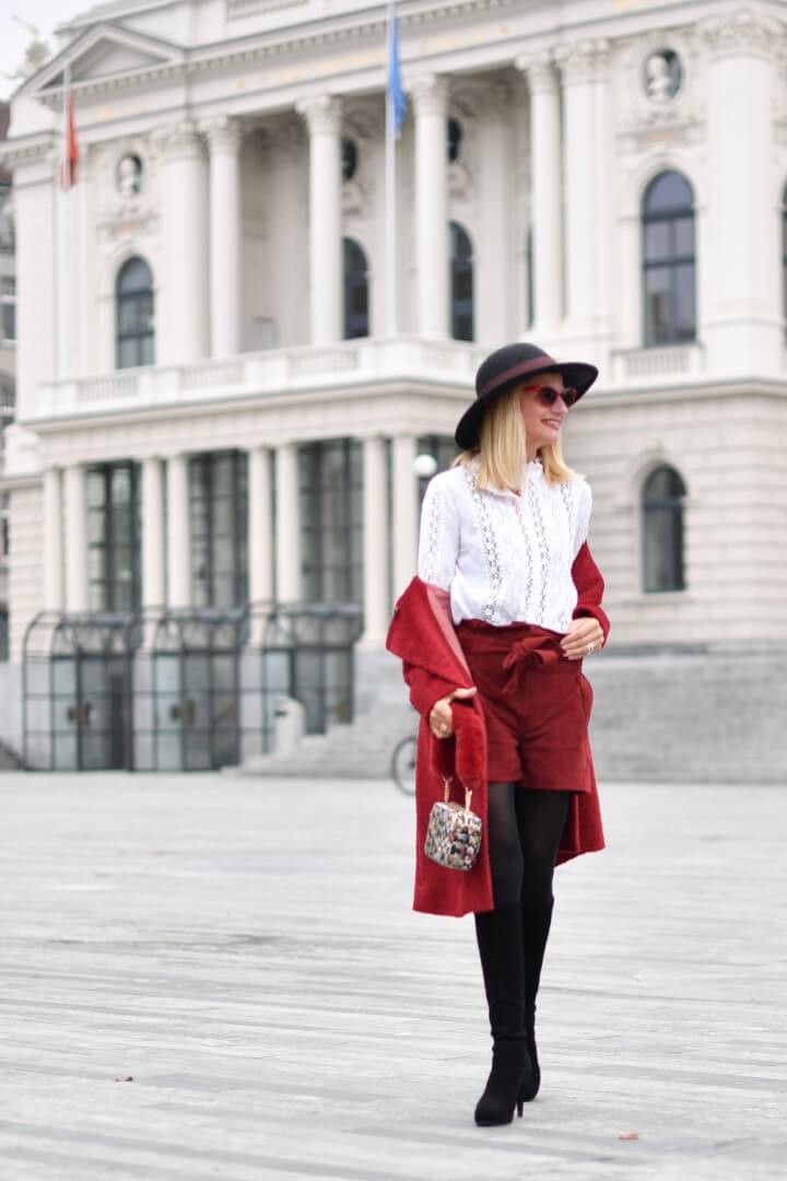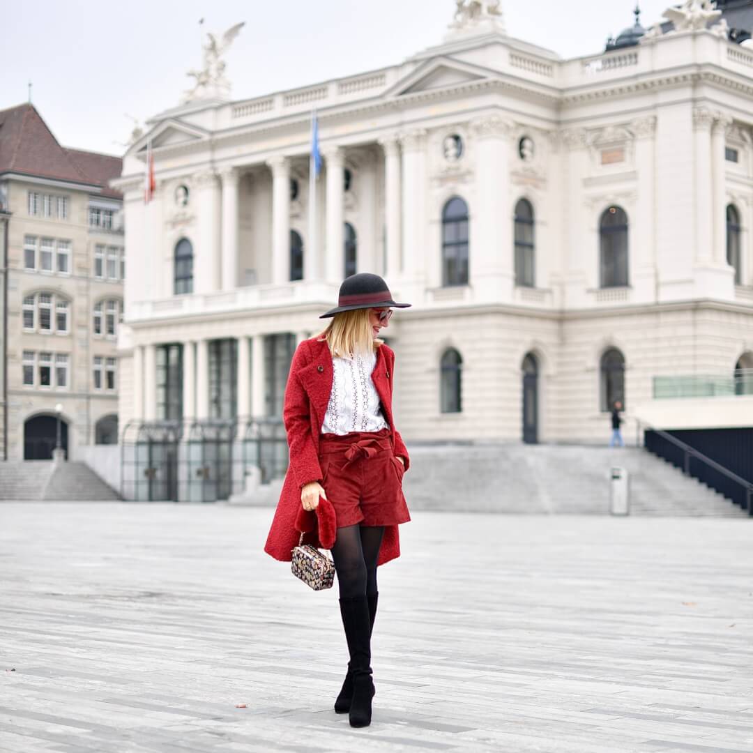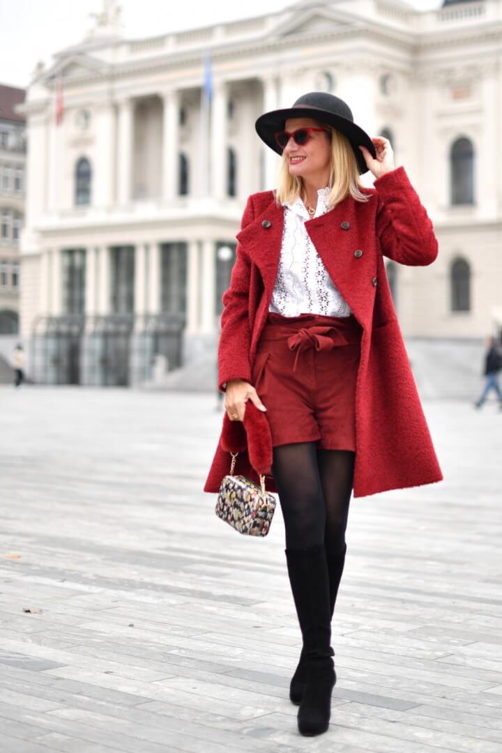 Love that you sort of created a fun, modern and crisp suit out of these brick-red pieces. Gorgeous coat, hat and button-down shirt. But I love the suede shorts the best. They are perfect for the cold weather! I always love your street style. =)