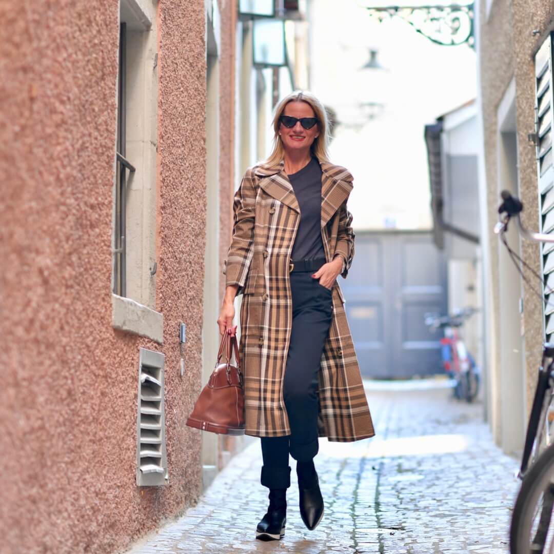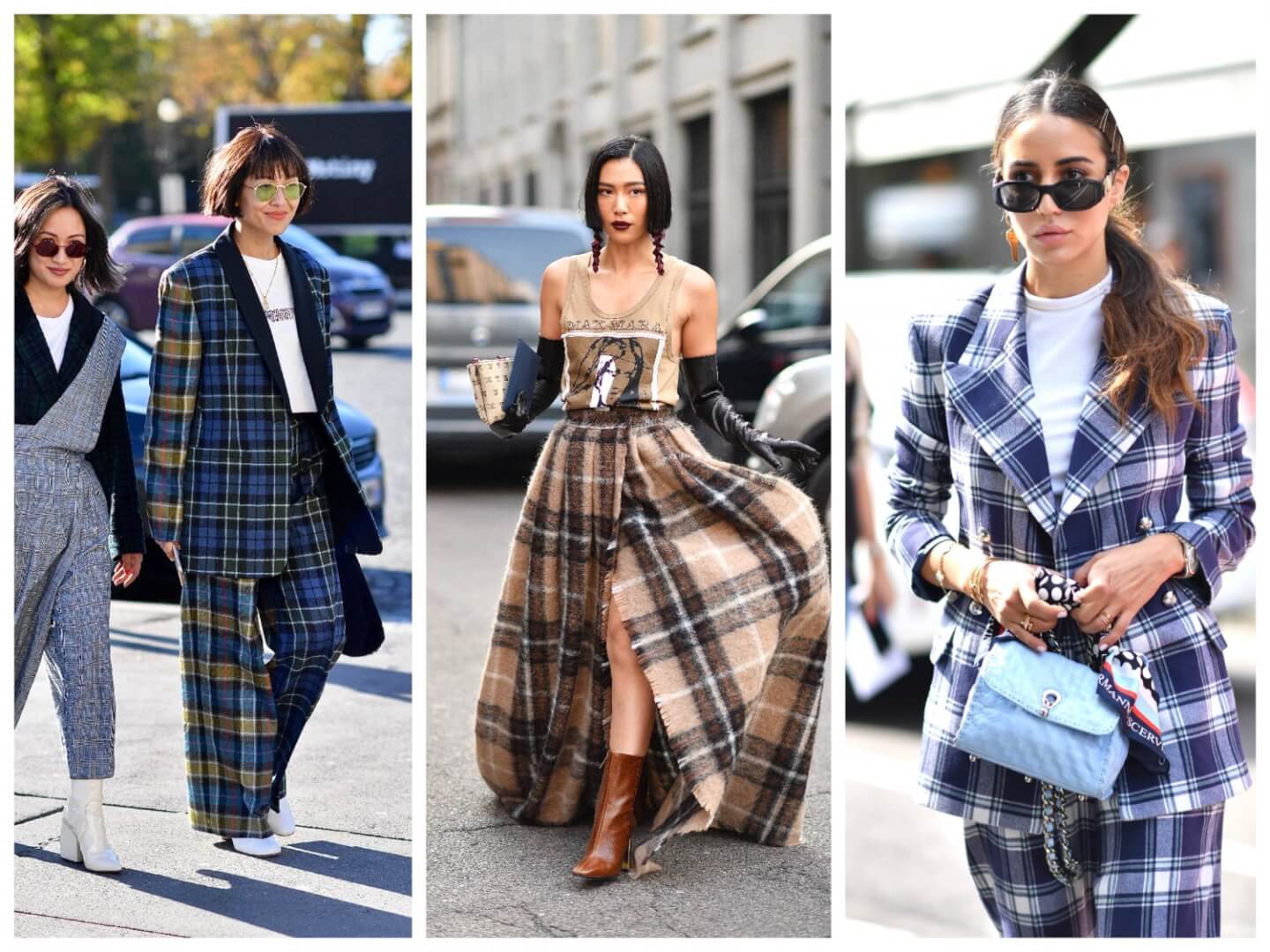 New this Autumn is the emphasis on blue toned tartan… often matched with a pale blue bag. This goes in line with the overall theme of colour this coming Autumn.
