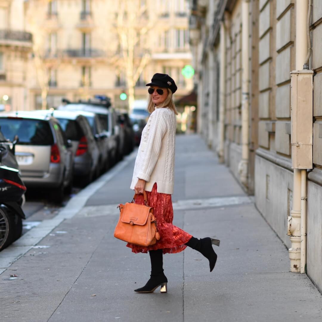 Perfect the outfit by repeating the same colour as your sweater somewhere else in your outfit: bag, shoes, or simply an accessory.
