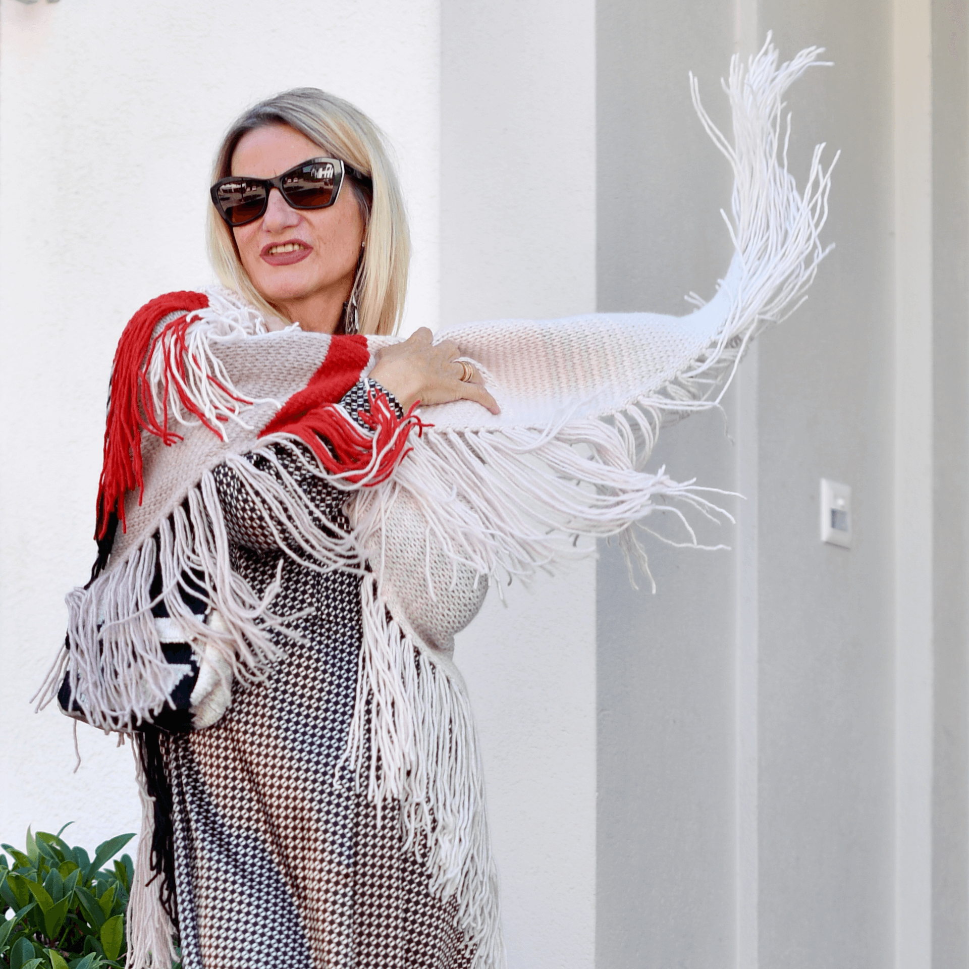 4. Keep wearing silky dresses by adding oversized knitted scarves