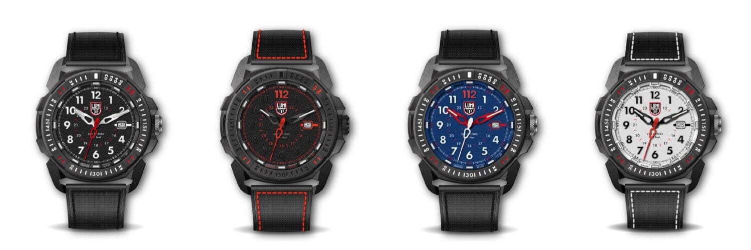 Luminex created the ICE-SAR series of watches with CARBONOX casing for robustness and ultra-light weight. A hard sandblasted dial, interpreting the lava fields that cover 30% of Iceland. Note how on some models the 12 index is replaced by the number 112. This is the common emergency number that can be dialed for free in several countries. There are four models of the ICE-SAR 1100 series.