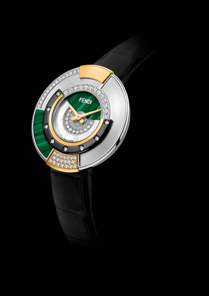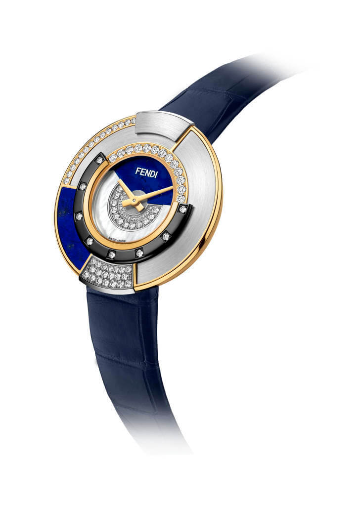 If you’re looking for that hot fashion statement the FENDI Policromia is the perfect answer. Brilliant cut white diamonds set the time on the case and dial, paired with refined inserts of real stones — malachite and green mother of pearl; or lapis lazuli and blue mother-of-pearl. White and yellow gold add their timeless value enhanced by black rhodium-plated yellow gold.
