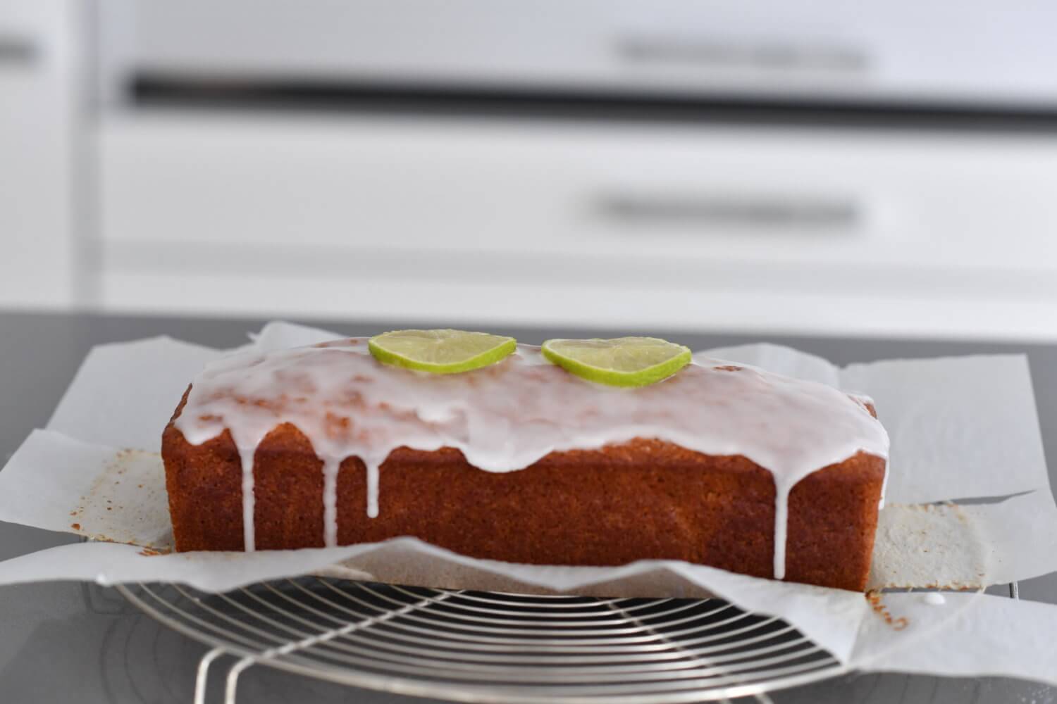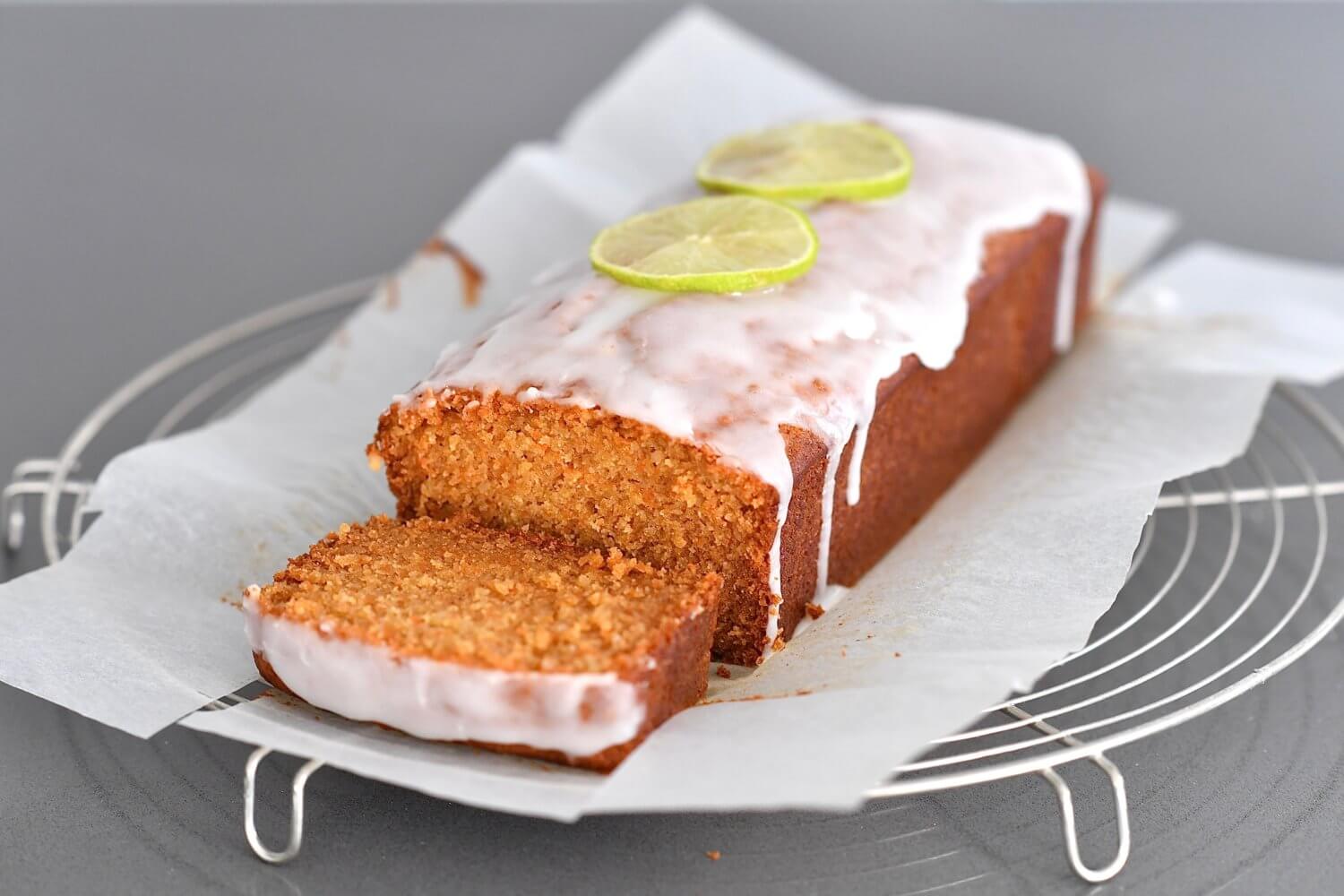 In a small bowl combine icing sugar, lime juice and zest plus just enough milk to get the consistency you desire. Pour over loaf and leave to set.