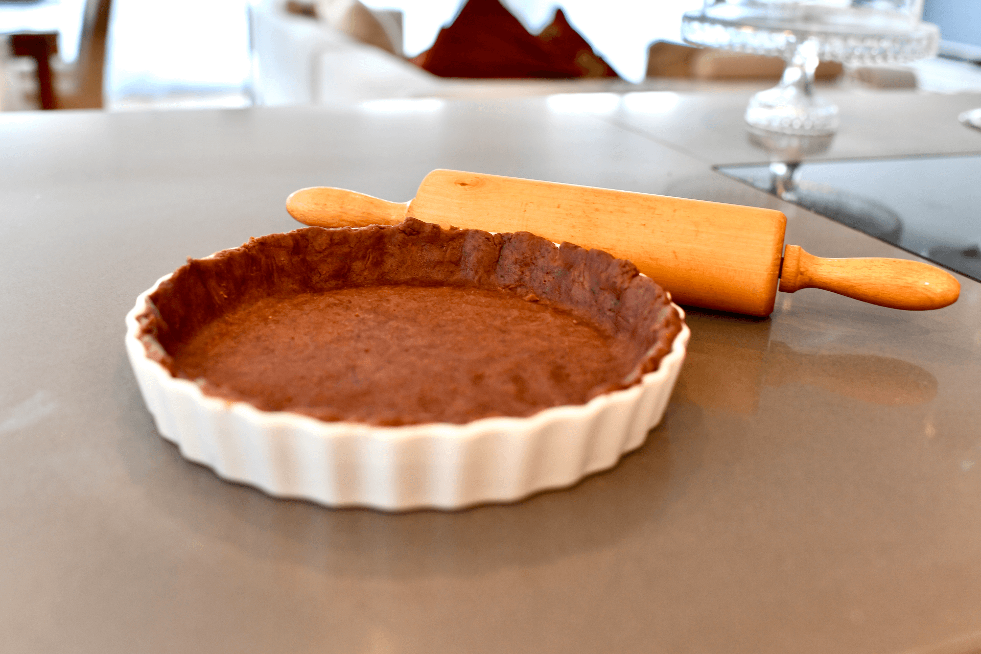 Then roll out between two sheets of baking paper into a circle that is a few centimetres larger than your tin. Gently remove the top layer of baking paper and invert the pastry into the tin. Press and trim the edges.