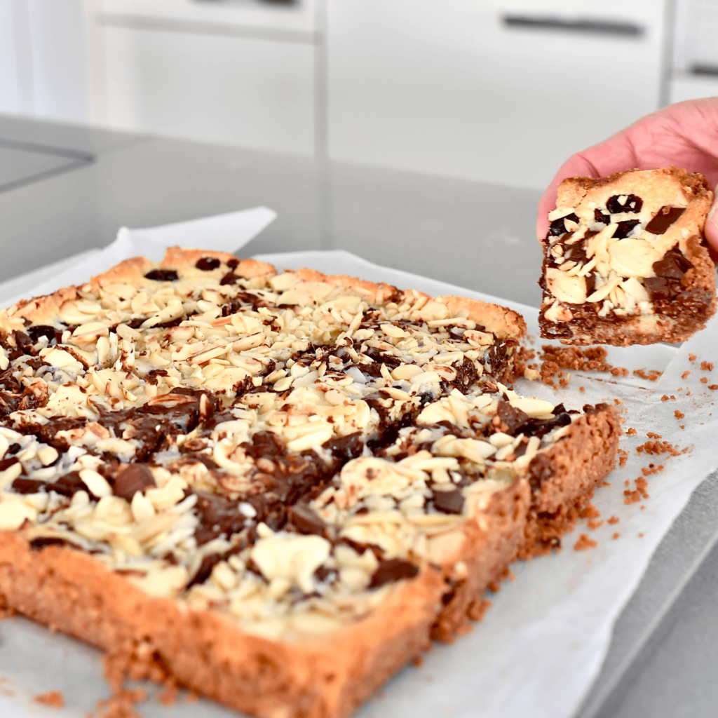 Line a 25cm by 25cm cake tin with baking paper and preheat oven to 160°c fan bake.