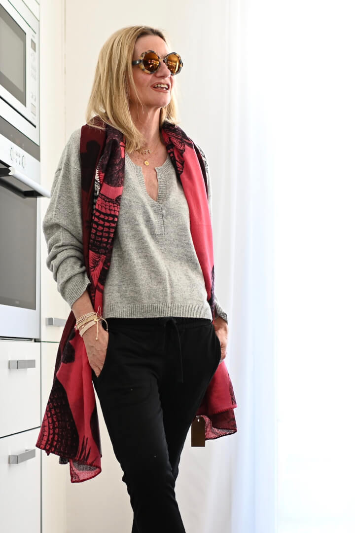 Currently wearing black sweat pants combined with a super soft grey sweater (available here) and scarf for a pop of colour and added cosiness.