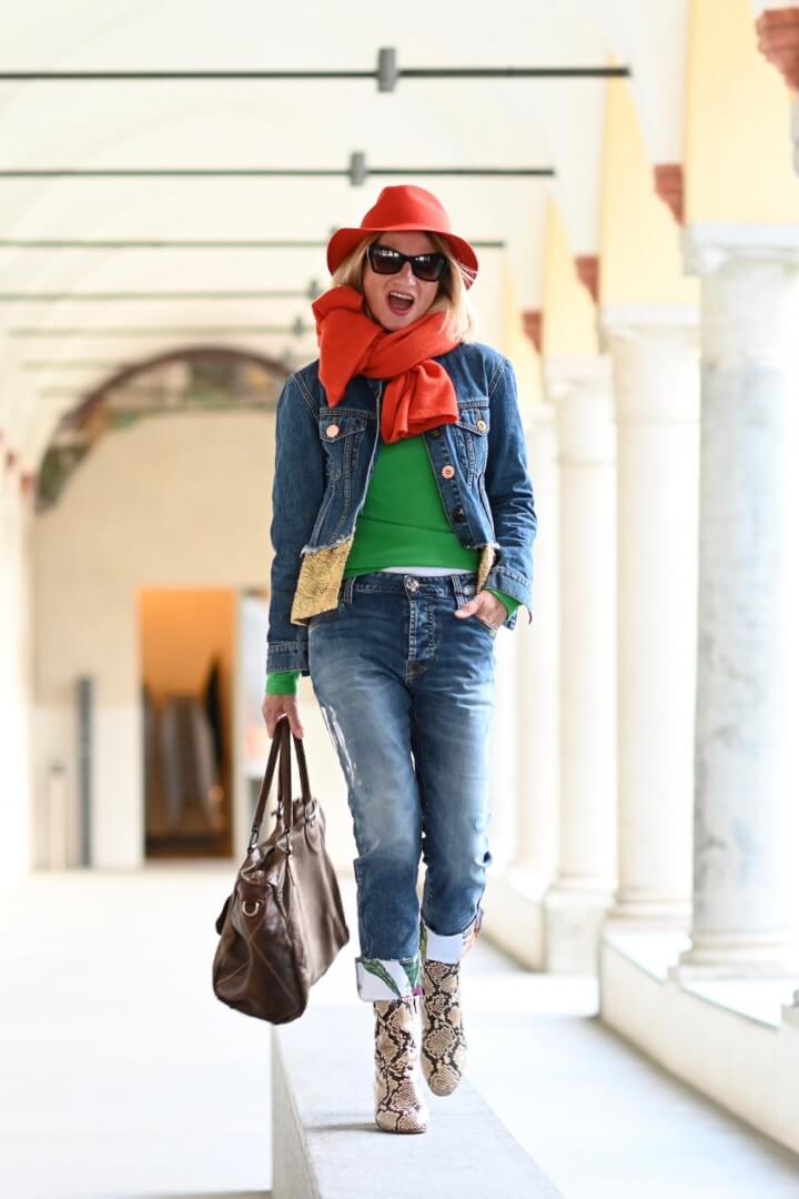 Fourth tip is to stick to a maximum of two bold colours and then team the rest of your outfit with denim and neutral tones. Note my favourite town boots worn here too!