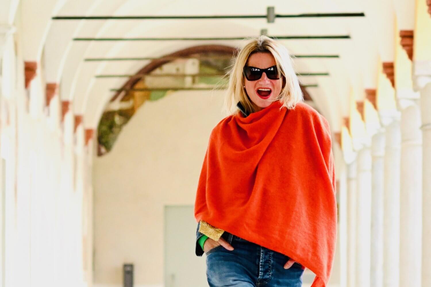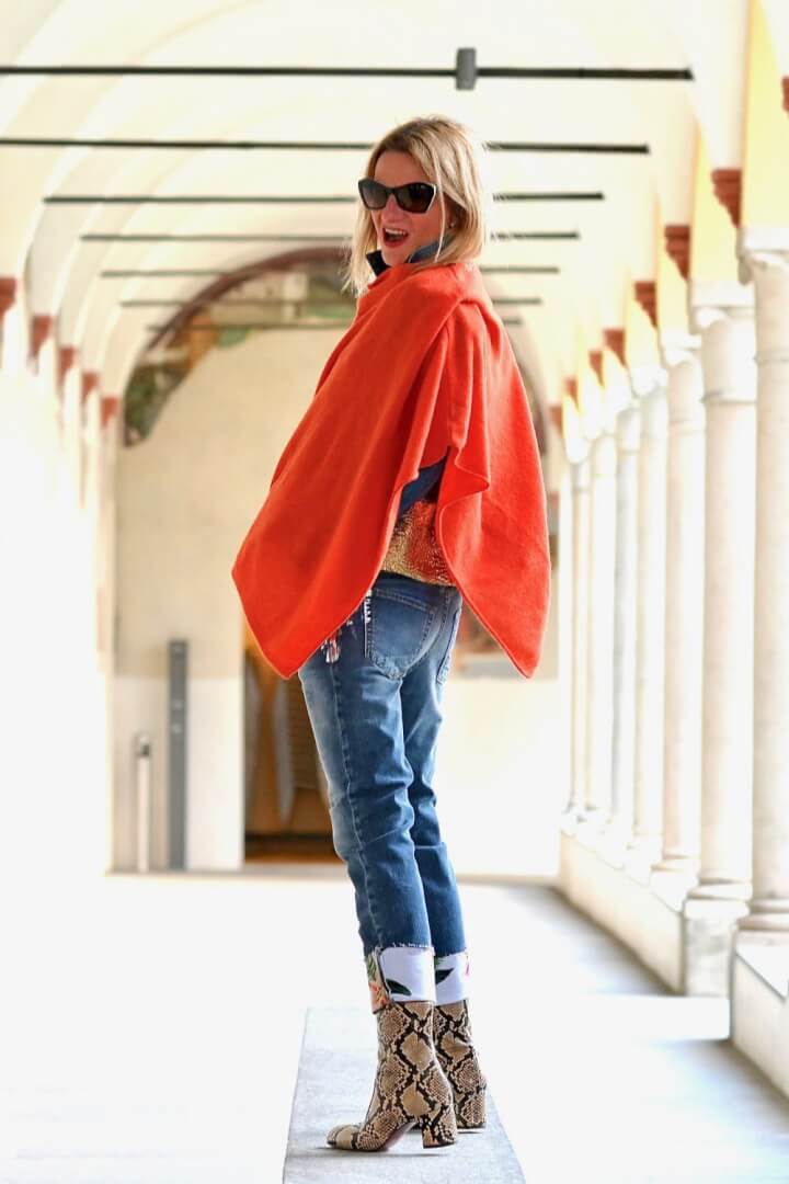 Second tip is to use knitted items for colour. They can be worn in so many different ways. You just need a little imagination. This poncho for example is also worn as a scarf in the pictures above.