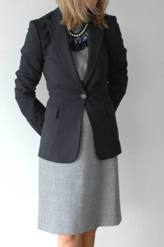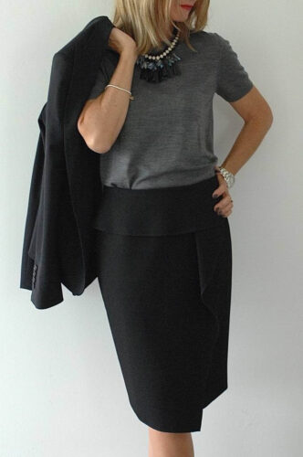 We have a board meeting today so am going to wear a skirt suit. The jacket is the same as that worn other days as the suit comes with both trousers and jacket. Depending on how I feel and how cold it is I will wear a blouse under the grey short sleeved top – probably not the necklace for the meeting.