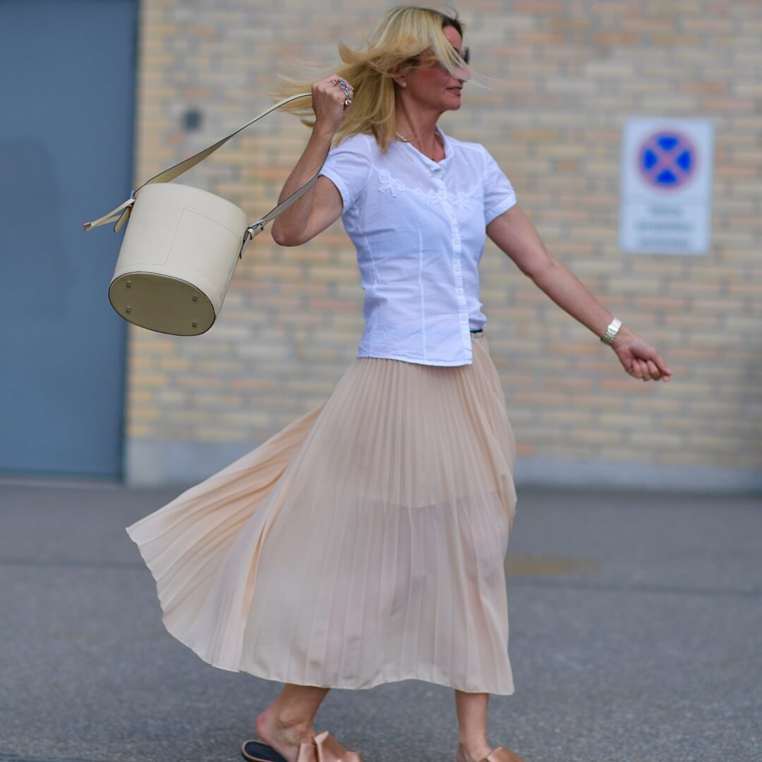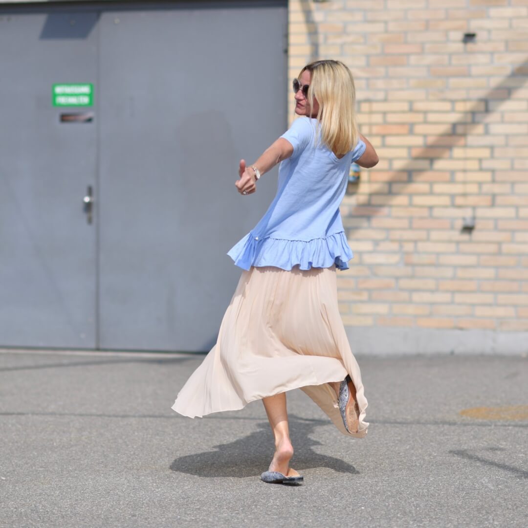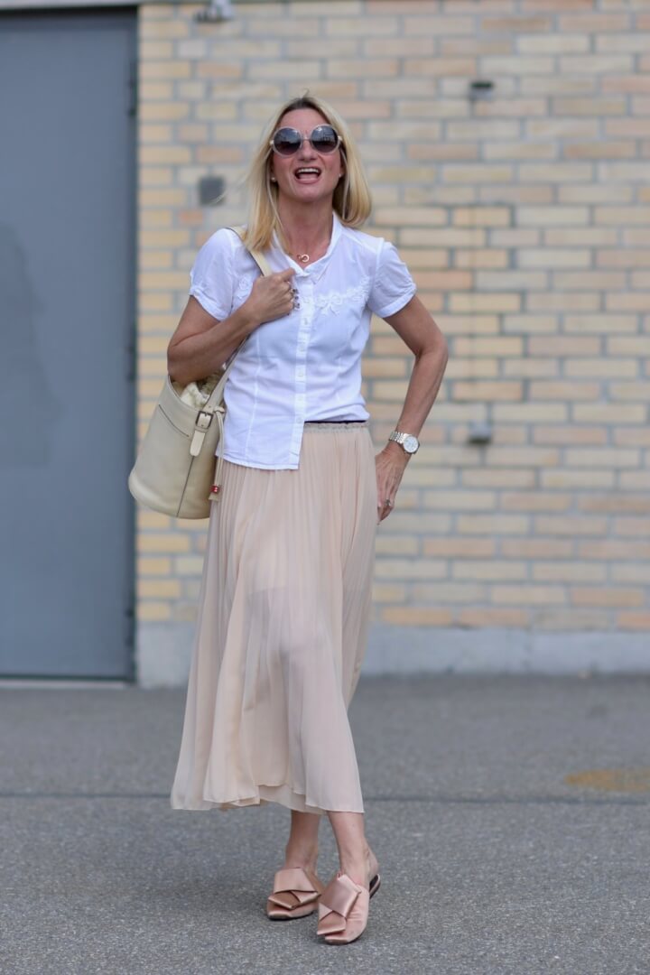 The only pastel coloured skirt I own is this pink one – bought two years ago on holiday in Dubai. So it had to be a whole pastel outfit around that skirt. First thing I remembered a super cute Bally bag I bought over 10 years ago and then a few years ago gave to my daughter so I asked her if I could borrow it for the photo shoot. Fortunately she said yes but only if she approved of the overall outfit – guess this is fair enough – smile!