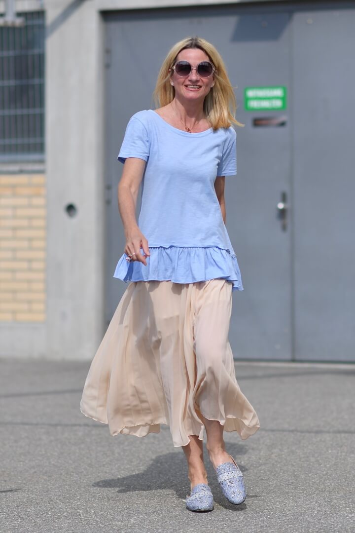 Pastels are a lot more tricky to combine successfully that many other colours. Especially if the whole look is to be pastel. One trick is to get the tone right. The shoes and skirt in this outfit are not exactly the same tone but they complement each other nicely.