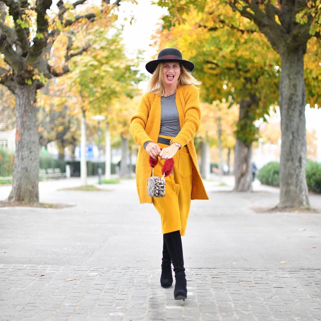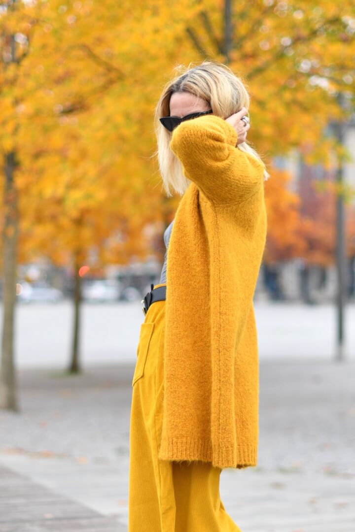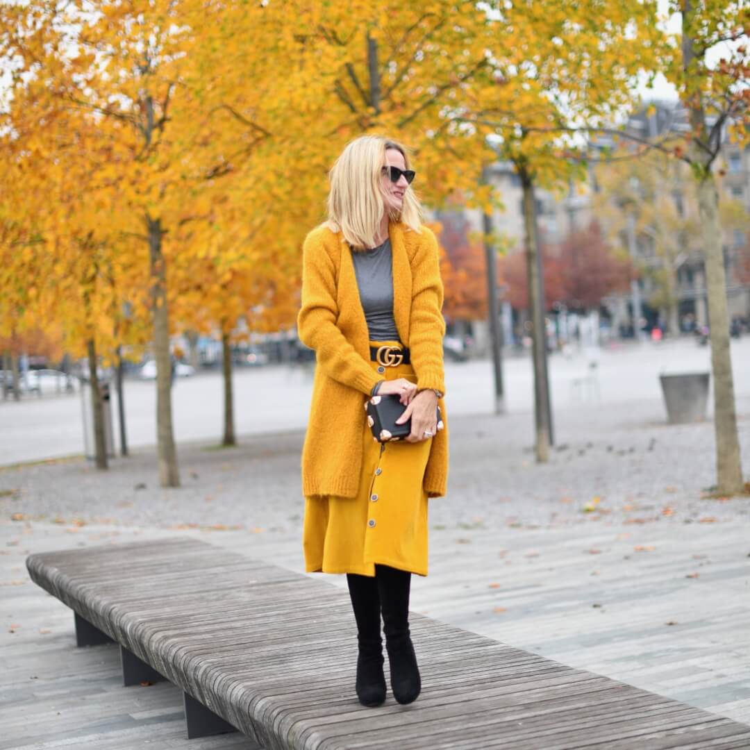 The colours you are wearing are just beautiful ! Love the grey and mustard together , it’s really unexpected and so great together. The tree in the background is stunning , just proving that nature knows fashion better than anyone ????????