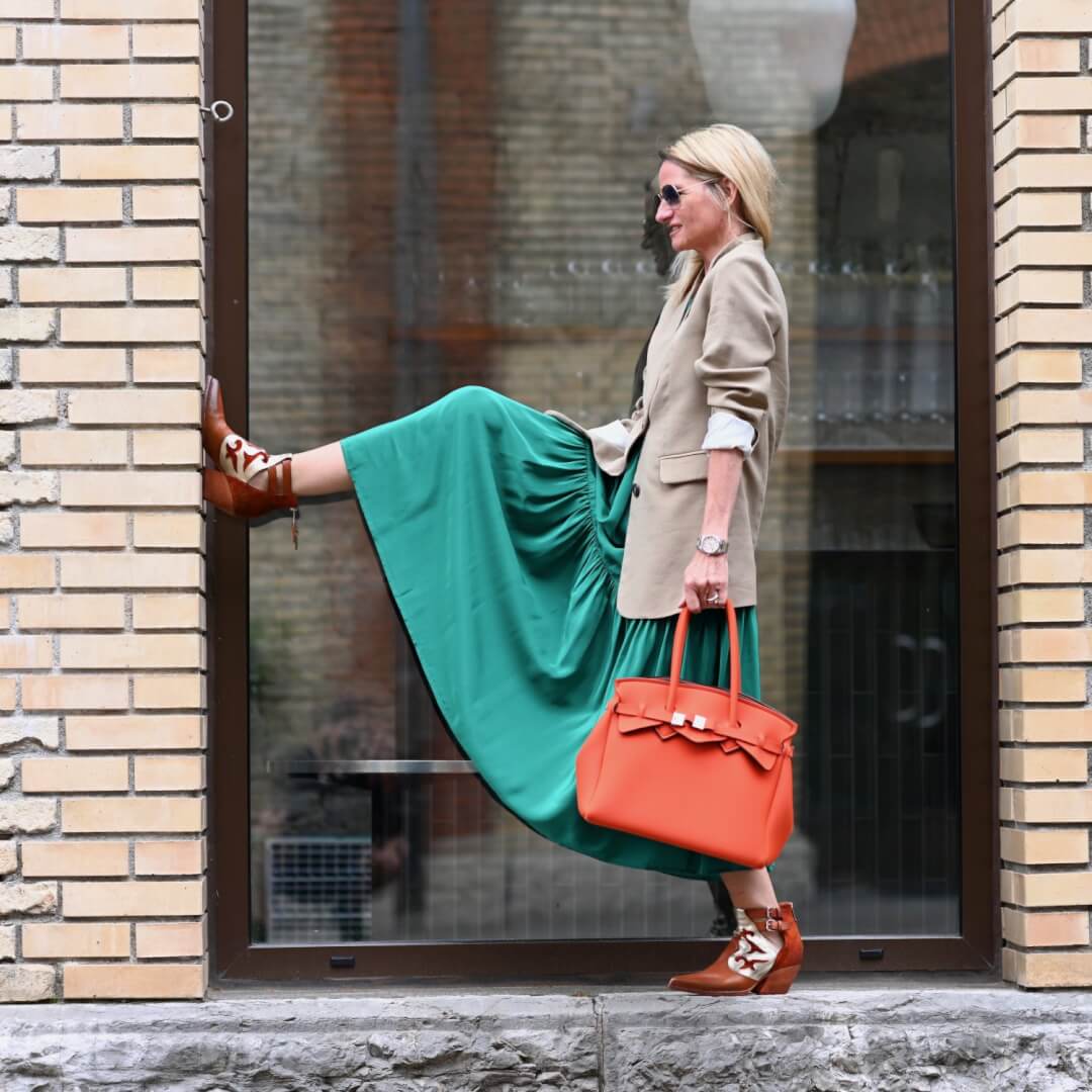 The dress is a beauty and so are the boots. Orange for me is an excellent colour near my face. But you solved it cleverly with that pretty bag.