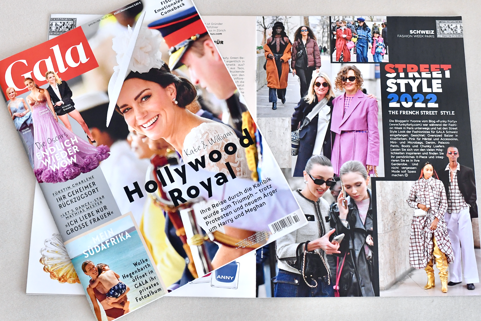 Street style photos taken by and of FunkyForty during the March 2022 Paris Fashion Week published in “Gala Schweiz” magazine.