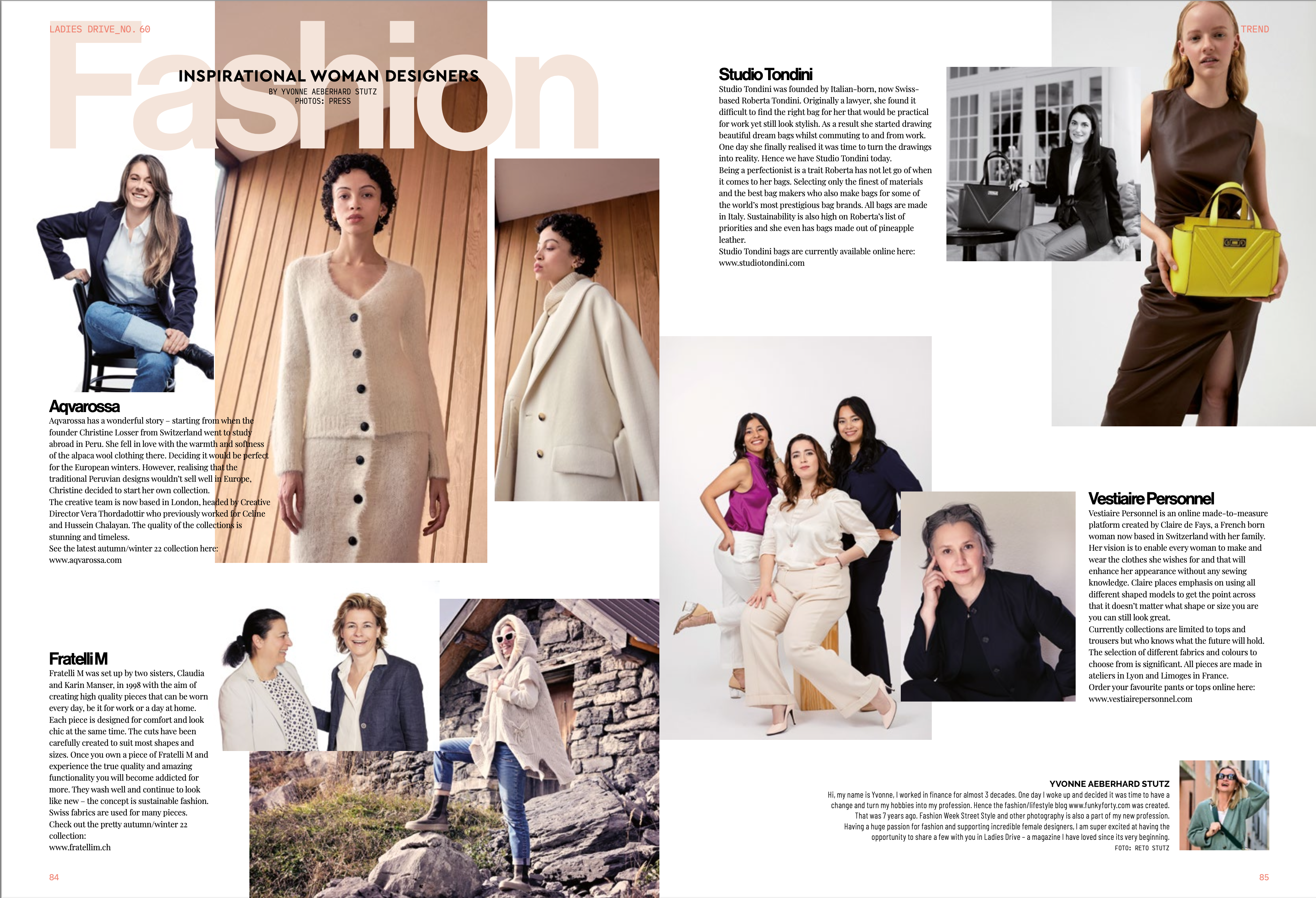 Ladies Drive – December 2022 Ladies Drive Magazine December 2022 Article featuring 4 fabulous women fashion entrepreneurs: Aqvarossa FratelliM Studio Tondini Vestiaire Personnel Do check out the Ladies Drive website for more business news specific for women and many great networking events taking place: www.ladiesdrive.group FunkyForty Hi! I’m Yvonne, a 40 something (wink) Kiwi, living in Zurich. I love fashion, travel, shopping and food – believing chocolate will cure almost anything! Previous Article Ladies Drive - September 2022 Next Article As per Vestiaire Personnel No Comments Yet Leave a Reply Cancel replyYour email address will not be published. Save my name, email, and website in this browser for the next time I comment. Δ