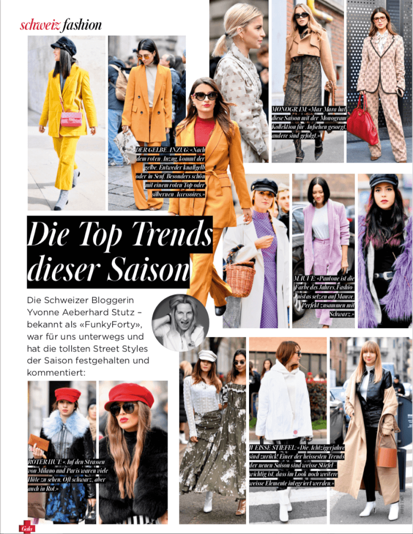 Gala Magazine – April 2018 April 2018, Street style photos taken by FunkyForty during the February/ March 2018 Milan and Paris Fashion Weeks published in “Gala Schweiz” magazine. FunkyForty Hi! I’m Yvonne, a 40 something (wink) Kiwi, living in Zurich. I love fashion, travel, shopping and food – believing chocolate will cure almost anything! Previous Article The Look Magazine - PKZ Next Article Fashion TV New Zealand - Interview No Comments Yet Leave a Reply Cancel replyYour email address will not be published. Save my name, email, and website in this browser for the next time I comment. Δ