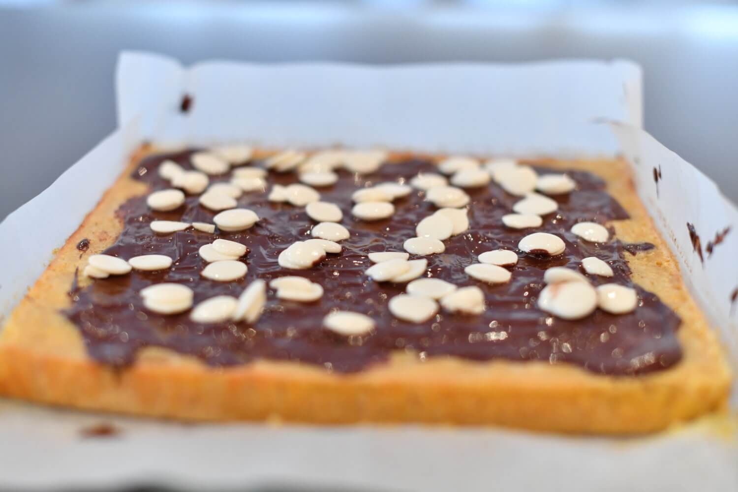 - Add flour and baking powder. Then press evenly into the base of the prepared tin and bake at 180° for around 20 minutes or until lightly golden.