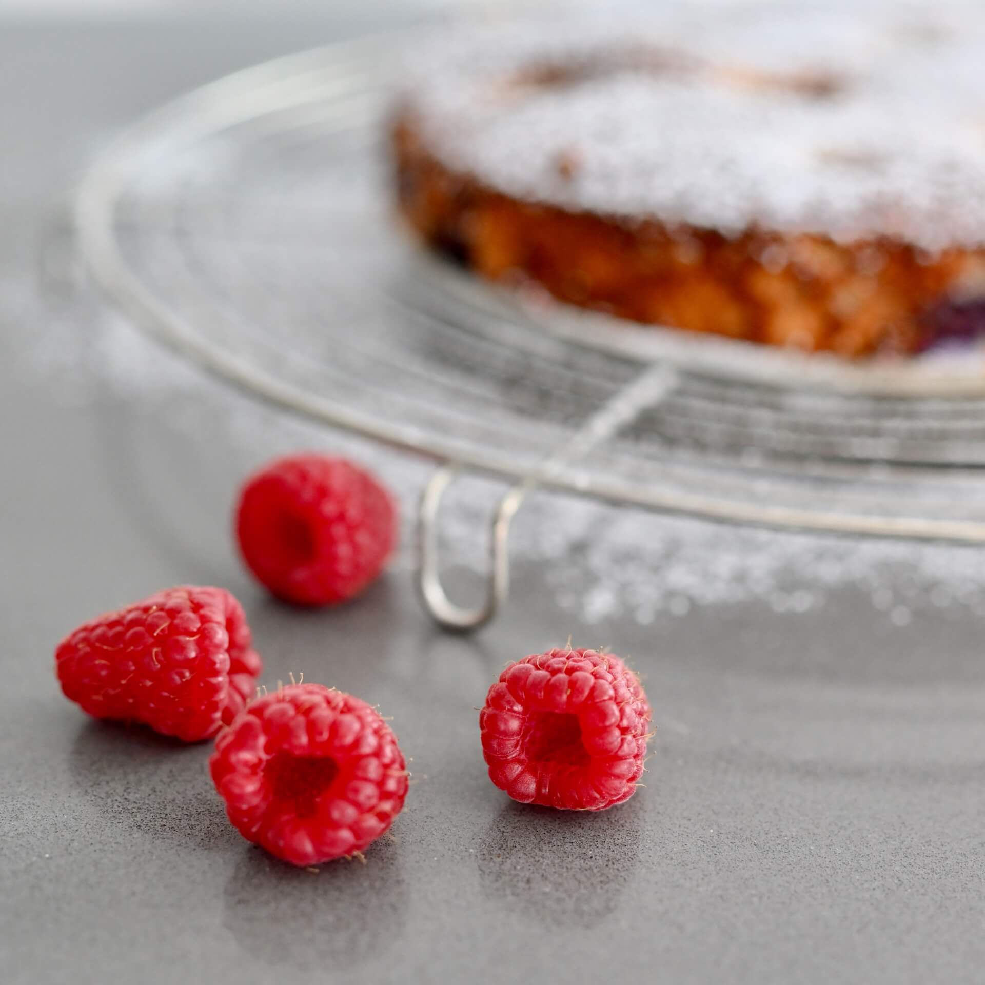 Top with the remaining raspberries, pressing them firmly into the top of the cake batter.