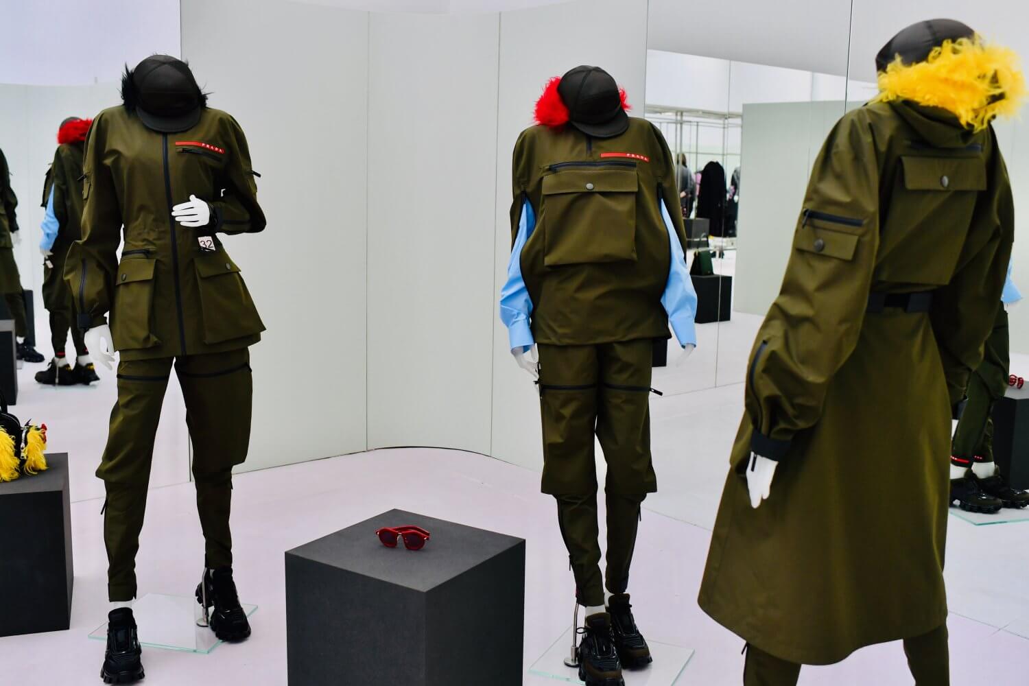 Is it time for all of us to stop expecting the new and reflect about the here and now of the World around us? Maybe the hidden be the message, with a continuation of military looks. The pale blue with khaki colour combination and the iconic Prada red rubber label.