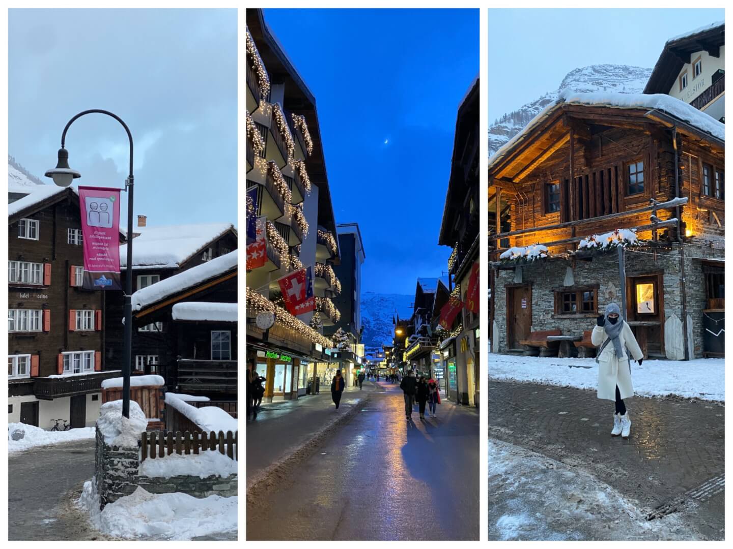 After settling into our room it was time to explore Zermatt a little. All the lovely shops are currently closed but it was still ever so pretty walking through town and seeing all the lovely traditional wooden houses. Note the super strict mask rules everywhere.