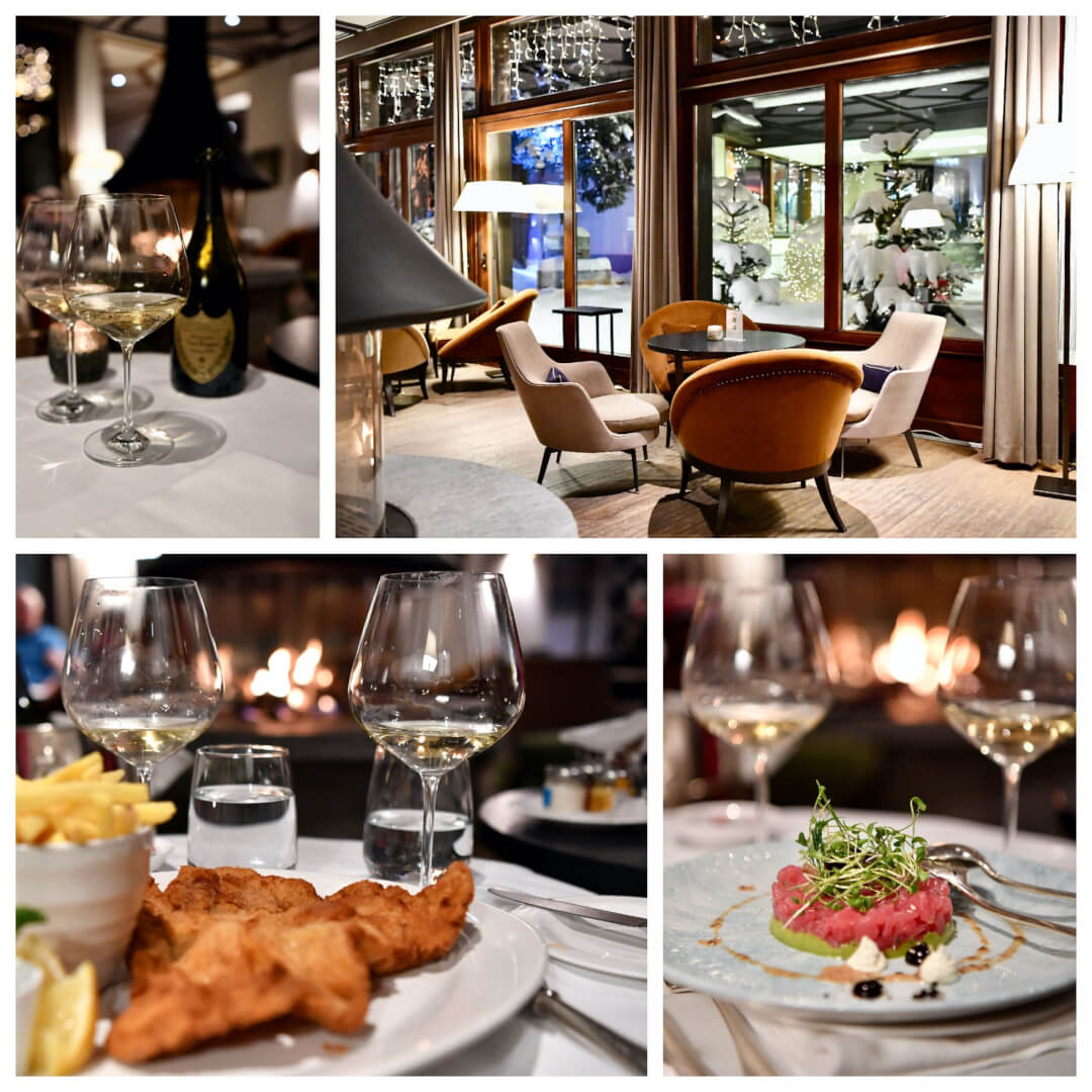 Dinner on the first evening was in the Grill Le Cervin. A lovely rustically designed restaurant with open fireplace in which the chef really does prepare certain dishes – great fun to watch!