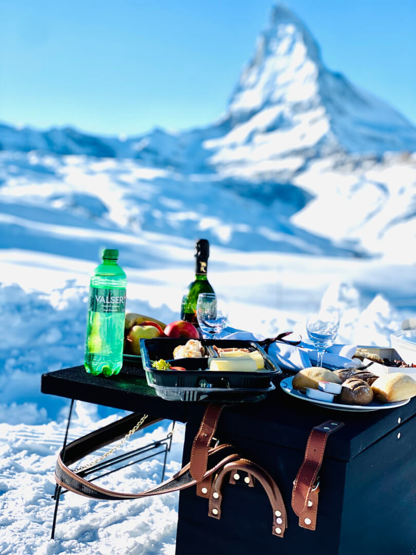 Our second day was a real adventure, with the most awesome picnic box created especially for us by Mont Cervin Palace. We took the Gornergrat train up the mountain, getting off at Rotenboden to find our perfect picnic spot.