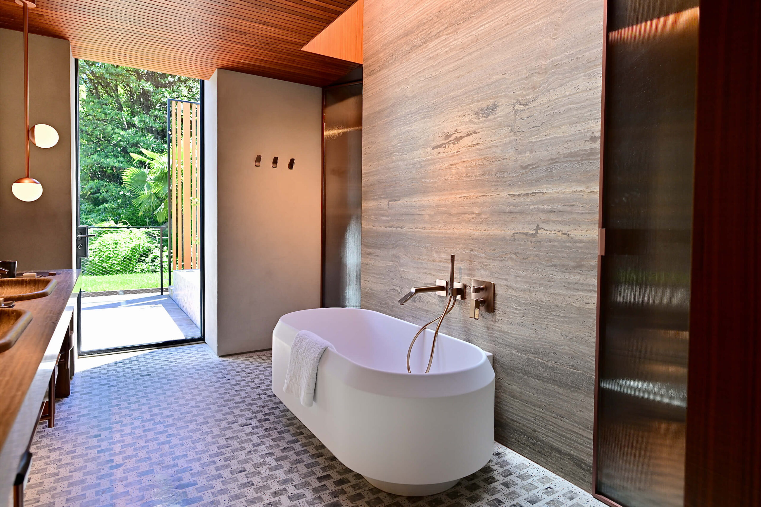 The suite was designed with natural materials, like Canaletto walnut wooden ceilings, Verde Alpi stone walls, and Venetian Terrazzo floors. Of course, views of the lake take center stage with the large windows perfectly framing the water and mountain scenery.