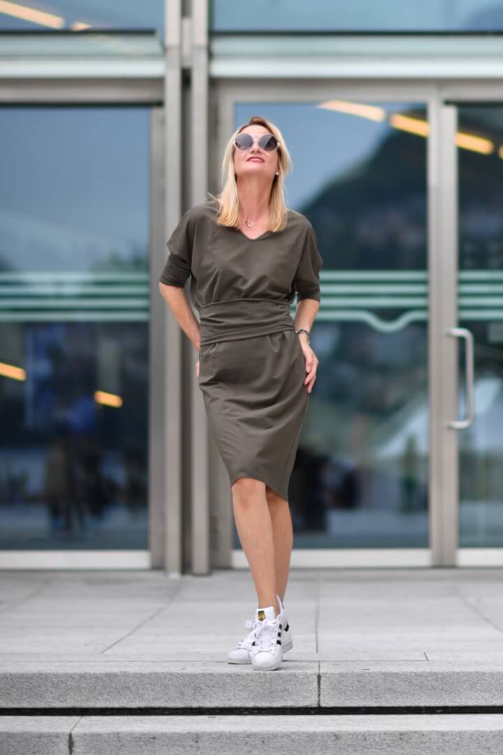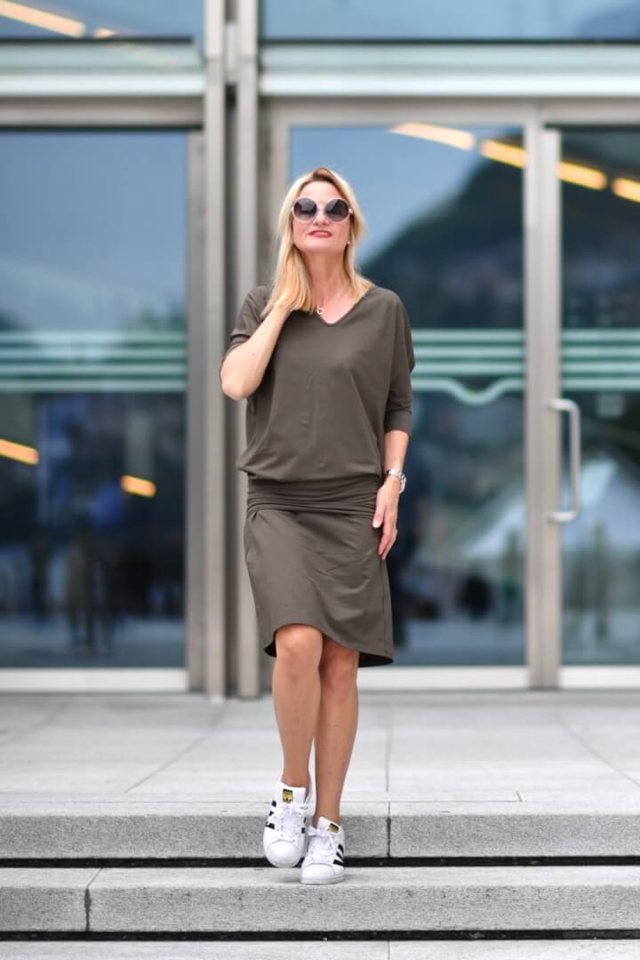 olive green is one of my favourite colors, so I felt really in love with your khaki dress. I love simple and clean style like this. And my big compliment for the combination with the sneakers. Just beautiful. Greetings from Luzern Martina