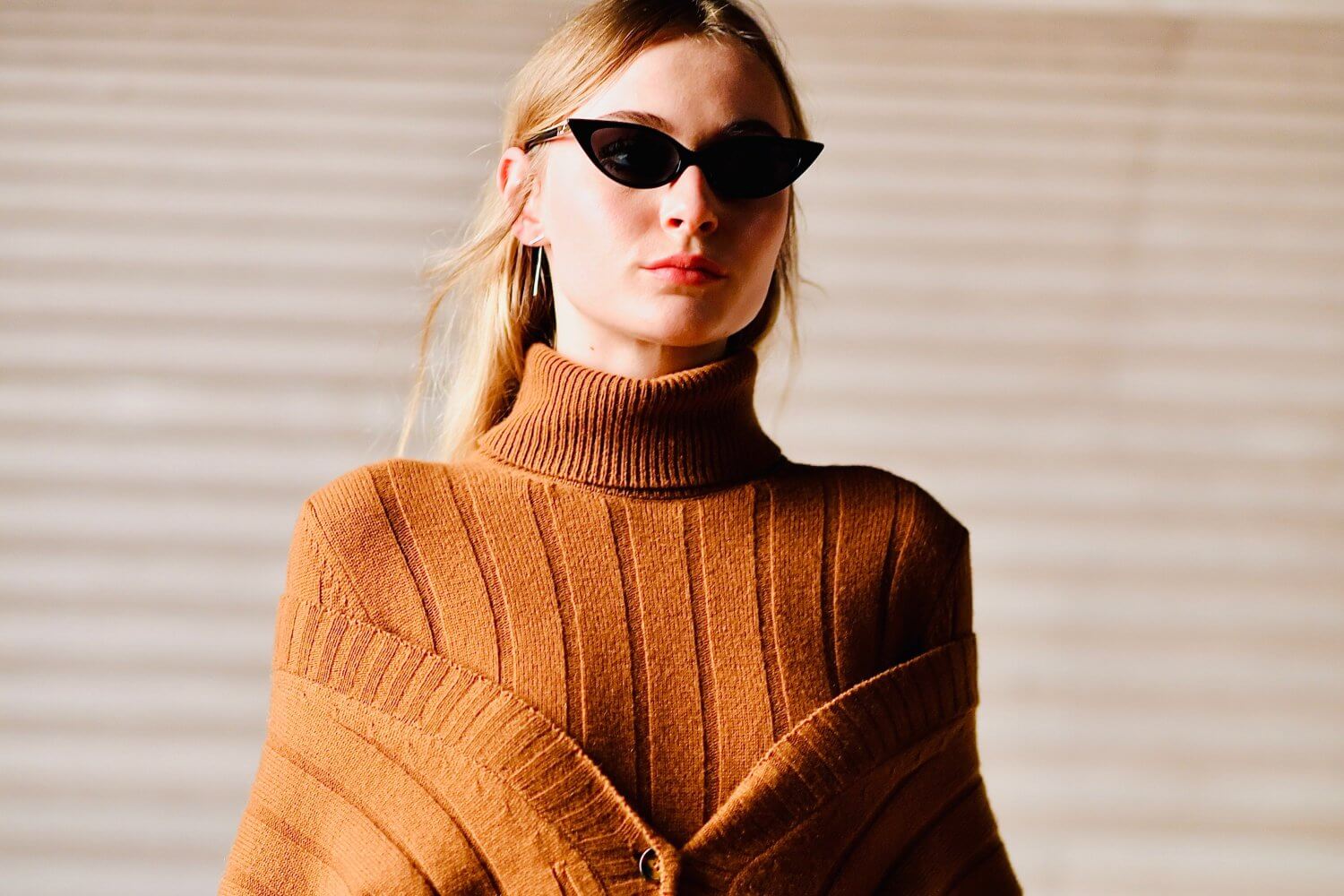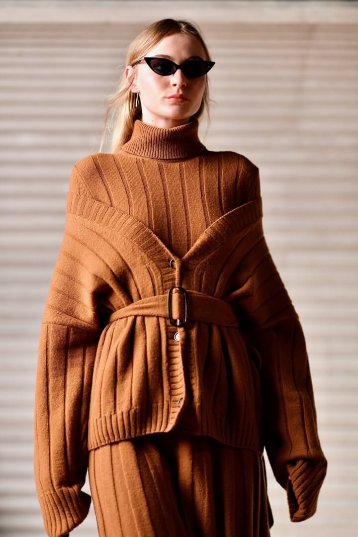 The Fall/Winter 19 collection is so very wearable with classic chunky knits given an artistic touch such as this camel knit…