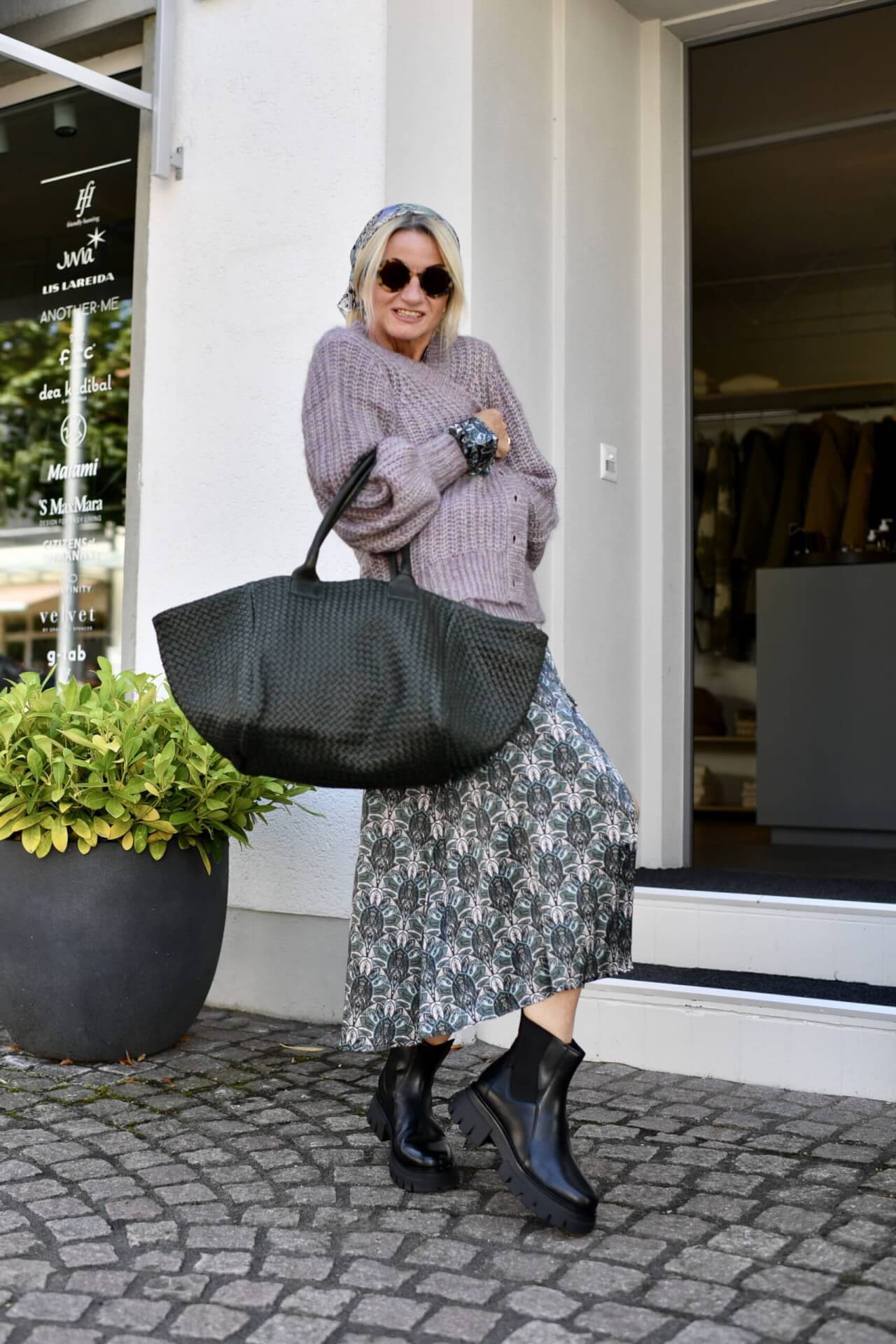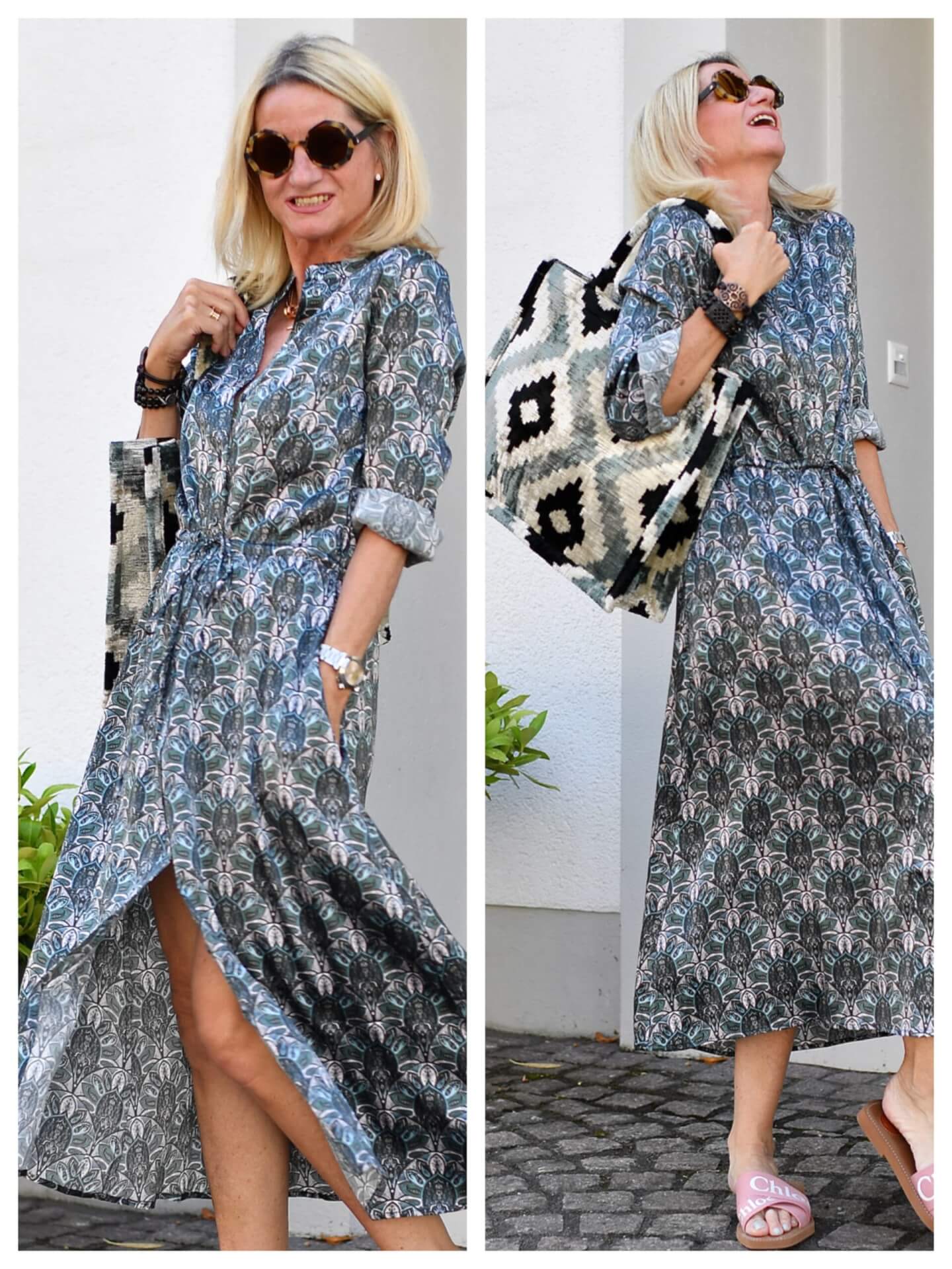 OK so we’ve all worn our dresses with sweater over the shoulder. These days I like to drape mine across one shoulder only for a bit of a funky look.