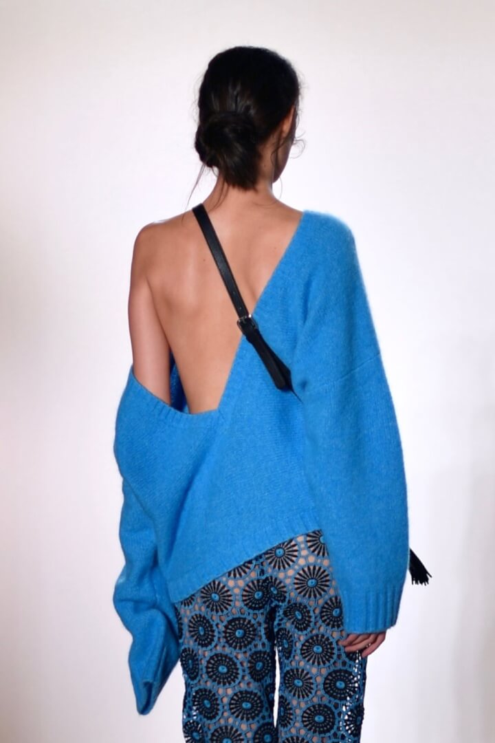 Blue featured large throughout the collection. Emphasis on asymetric design and off one shoulder looks.