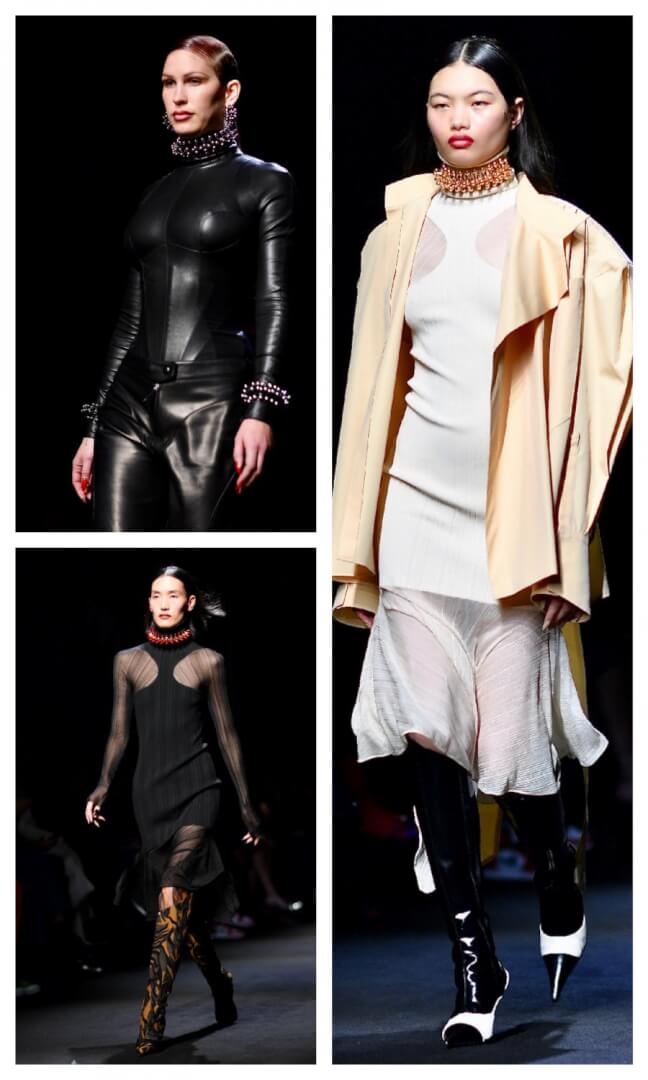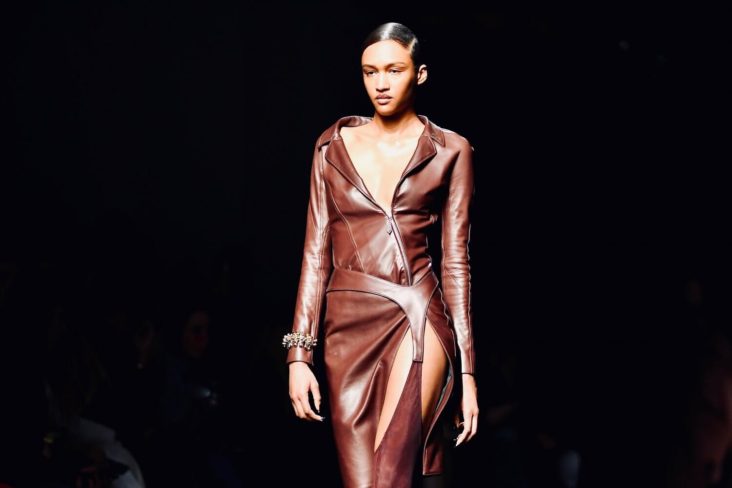 Designer Casey Cadwallader featured leather at Mugler for FW20. Featuring a mix of leather bodysuits and gowns with sheer or nude panels. Interesting to note too the diversity in models chosen. Proving to the world that anyone can look great in their collections, you don’t have to be paper thin!