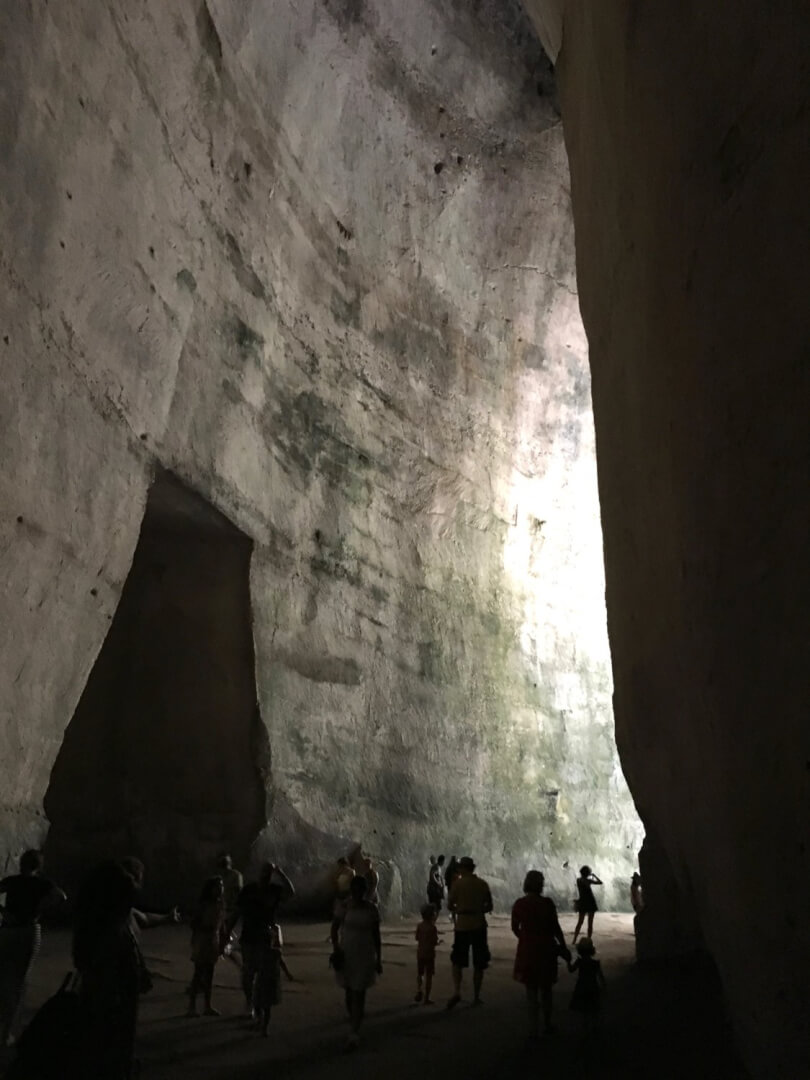 The legendary Ear of Dionysius is the most famous cave in Siracusa. In legend a prison built by the tyrant Dionysius. Don’t think he likes us either as a bird pooped massively on us as we were inside!
