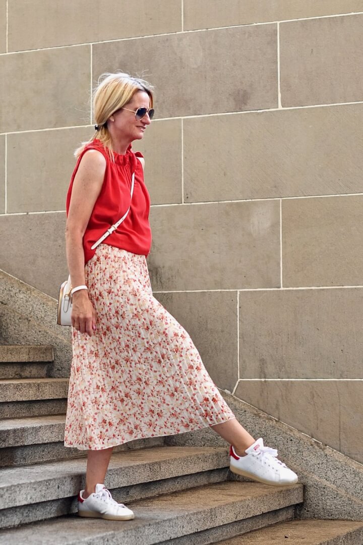 The top is super soft and floaty. However being bright red it makes an impact whenever worn. Shown here with my simply chic outfit of the season but it’s also great teamed with skinny trousers or shorts!