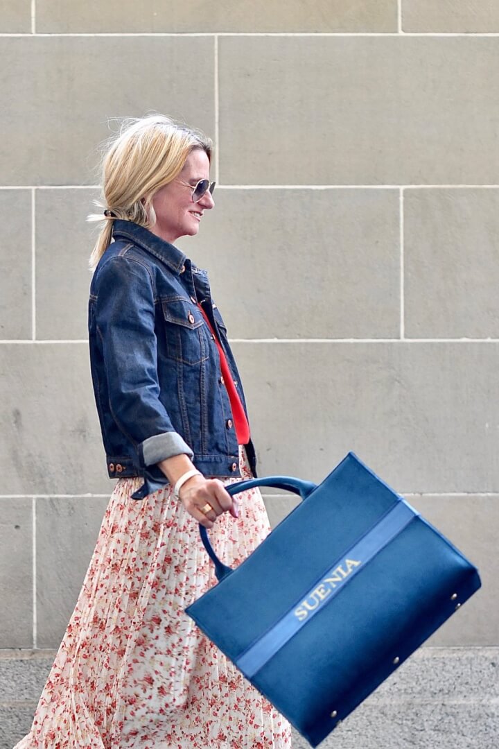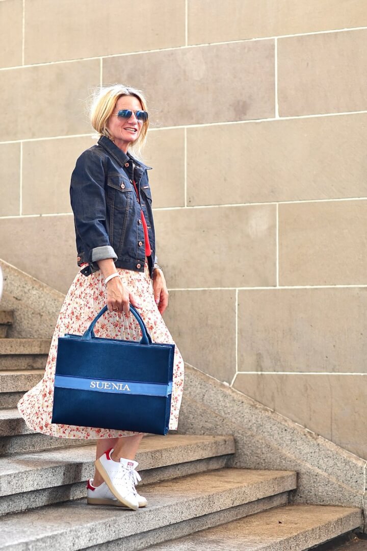 very chick I love your skirt and top and what for a good idea the big bag is it saves you to get rid of all those plastic bags love it