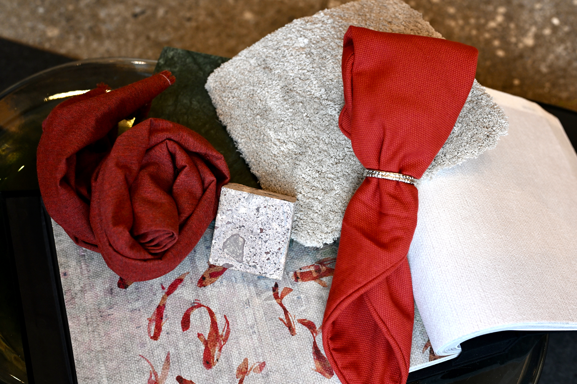 As a bathroom tends to have lots of water we’ve chosen a fish motive to bring a kind of river/outdoor feeling into the room. I added the green marble slab as it is one of my dreams to have a bathroom with green marble in it. The carpet slab is more to indicate a colour for bath mats and the copper/reddish tones for the towels.