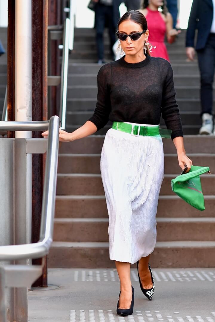 It’s all about mixing denim and leather. The leather skirt is crawling back!