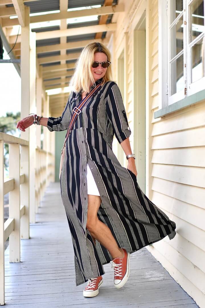 Favourite sandals change the look to being somewhat more dressed up. Usually believing heels should be reserved for shorter lengths – there is an exception when the buttons can be opened up as with this dress.