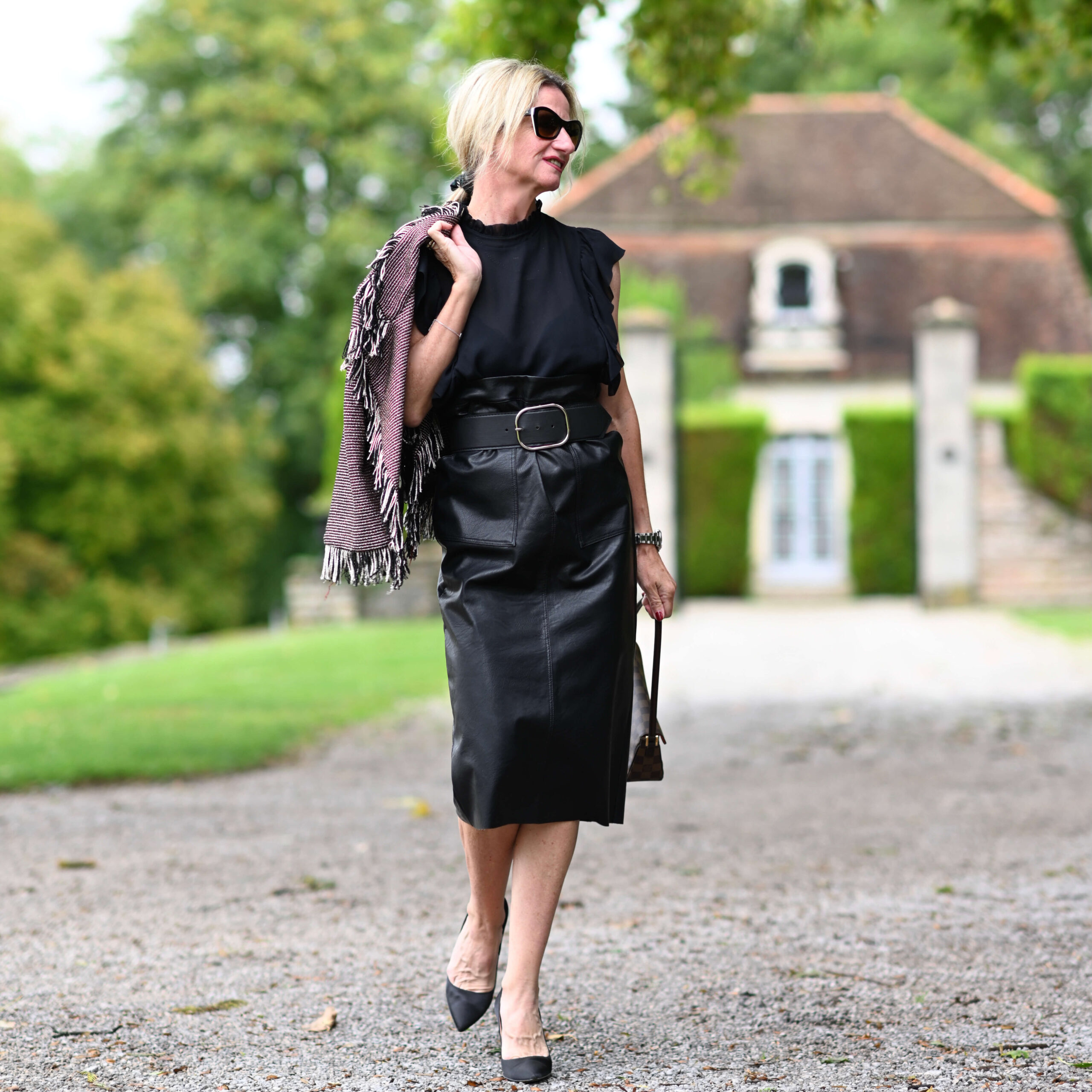 The skirt is actually vegan leather and especially designed so it can be worn either synched at the waist with a belt as I have done here. or alternatively worn longer as a hipster skirt.
