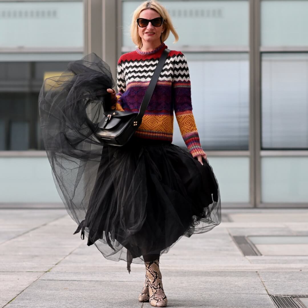 Tulle is currently to be rocked up. Wear it as you wish but “rock” the look with trainers, bulky knits or biker boots. Where possible opt for the sheer version, showcasing legs… yes we can do it over 40, especially in Winter when opaque tights are an option!