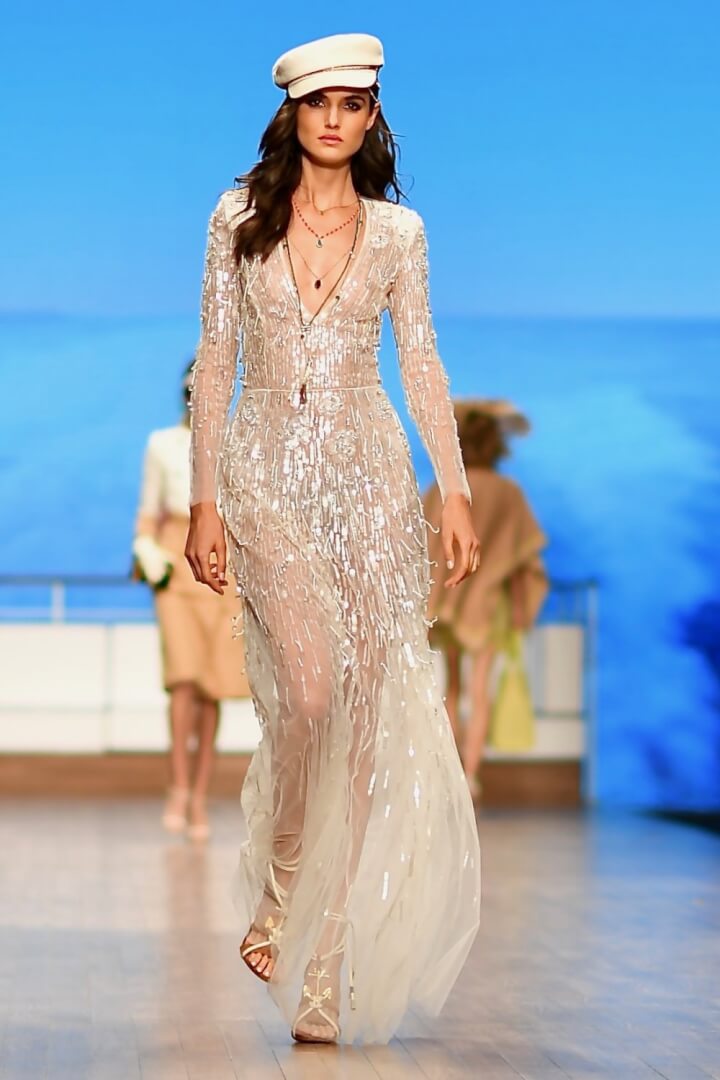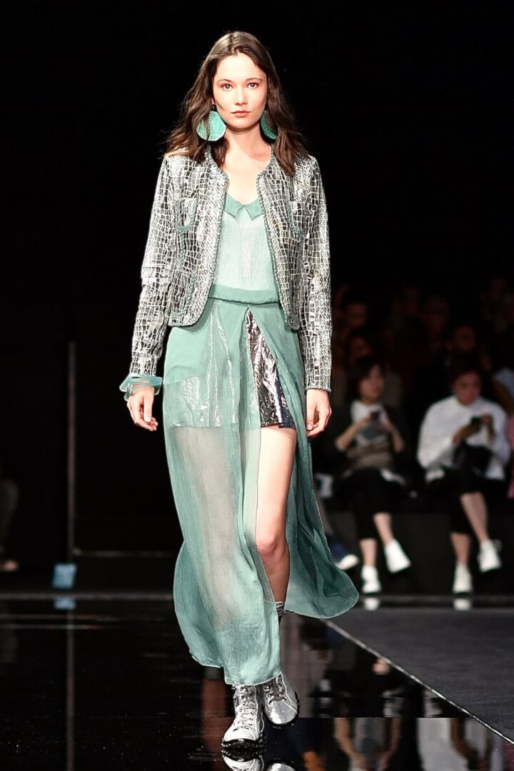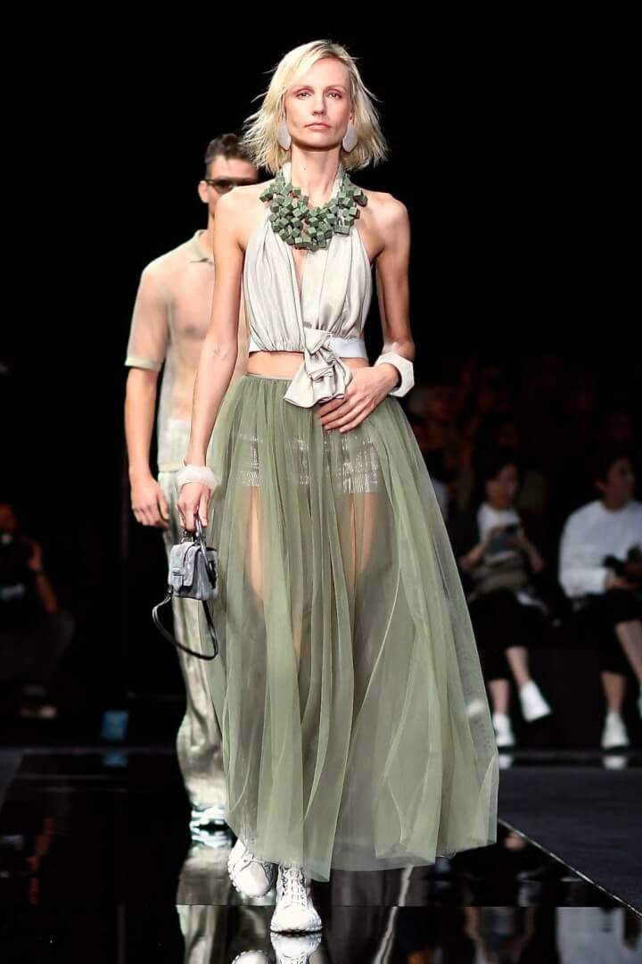 Tulle turned into an evening dress – also with emphasis on showcasing the legs. Picture taken during the Elisabetta Franchi show in Milan.