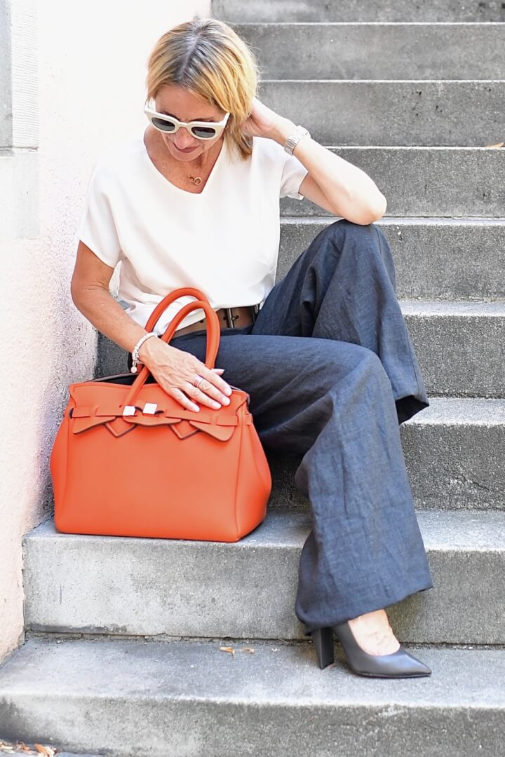 See the difference here when wearing this outfit with either the blue classic Louis Vuitton bag in the first photos or here now with bright orange bag.
