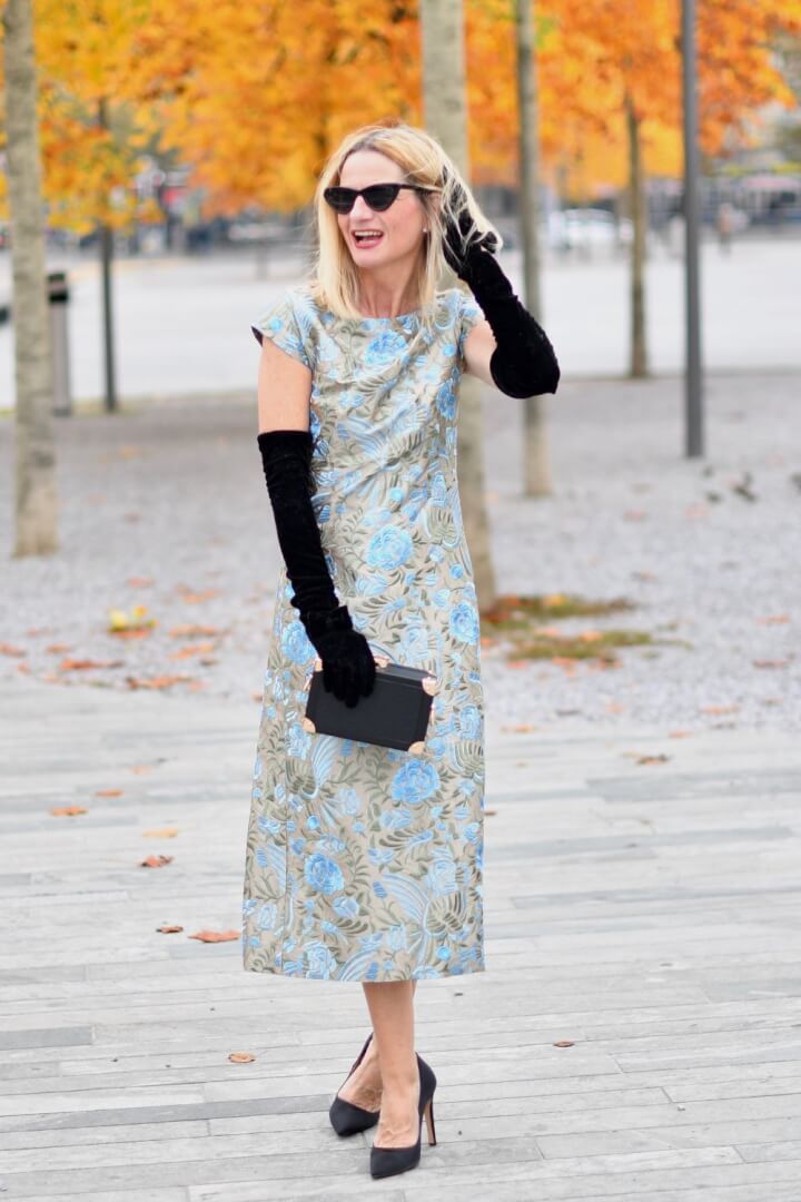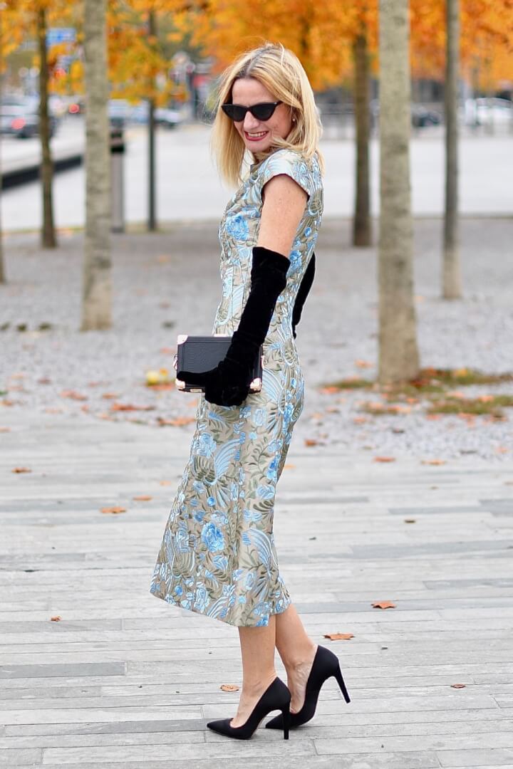 What a magnificent dress! And you are so, so right. I made the mistake in my younger years as well, to buy a black dress. Never again. For all the reasons you summed up. Love the heels and the clutch as well. As for gloves… I have a few for this purpose. Just no parties to wear them to haha.